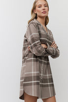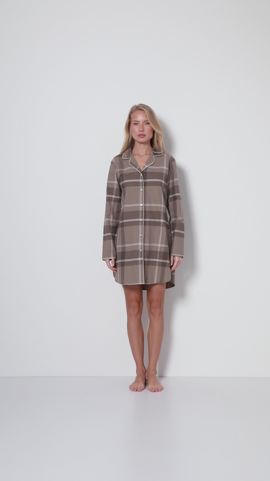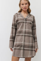 Klasyczna koszula nocna w kratę w kolorze taupe z kontrastującą lamówką.
