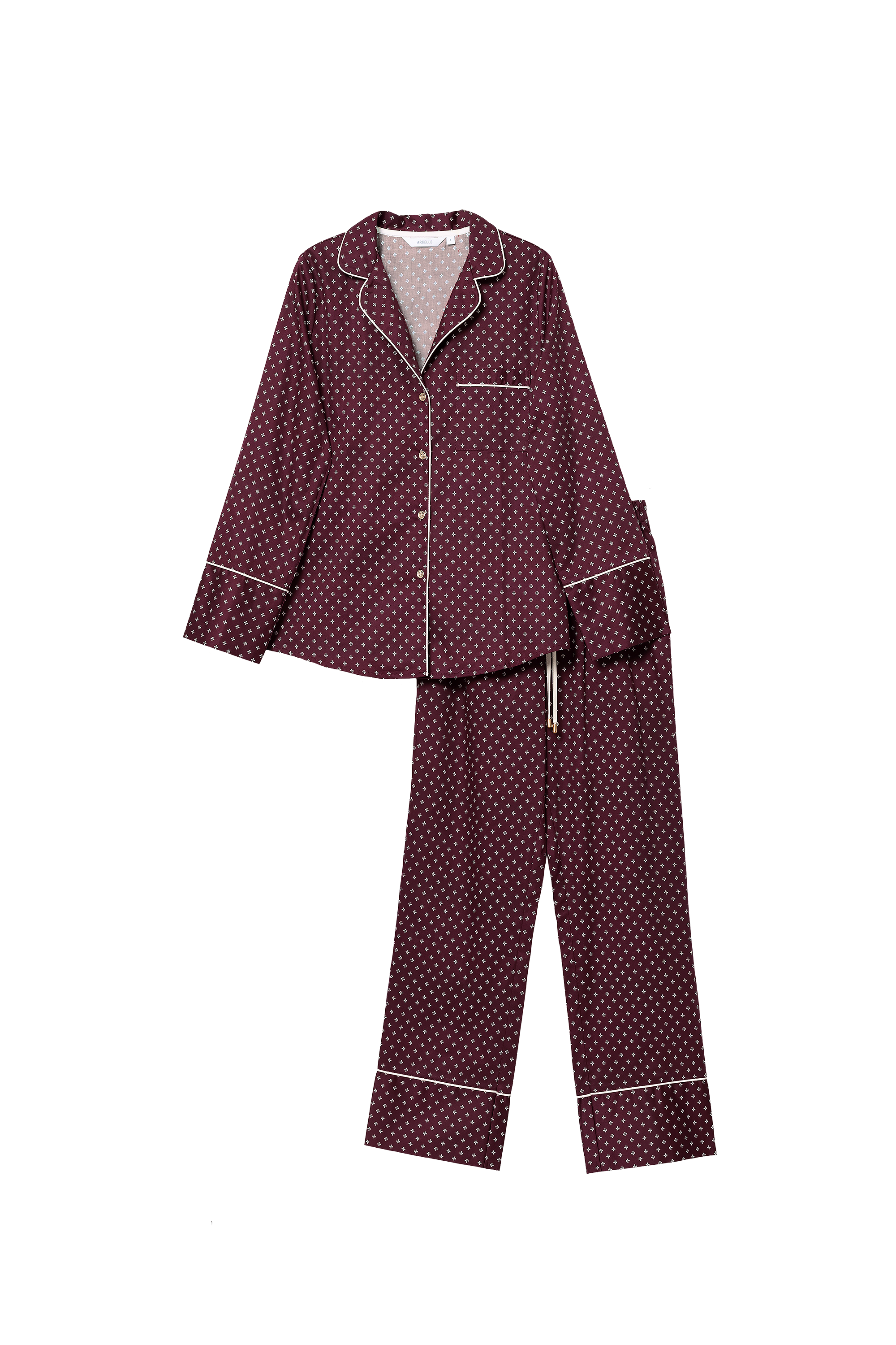 Komplet piżamowy w bogatym burgundowym kolorze z bezszwowym geometrycznym wzorem.