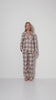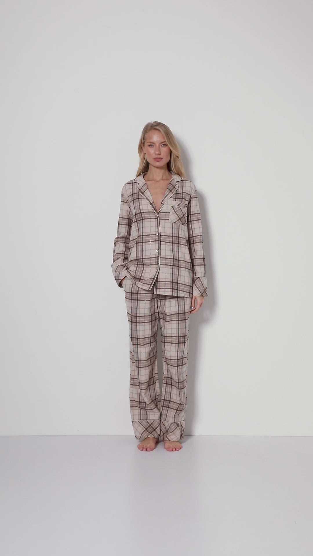Klasyczny i miękki komplet piżamowy w stonowanych, ziemistych odcieniach ze spodniami.