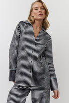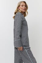 Luksusowy komplet piżamowy z spodniami w czarno-białe paski.