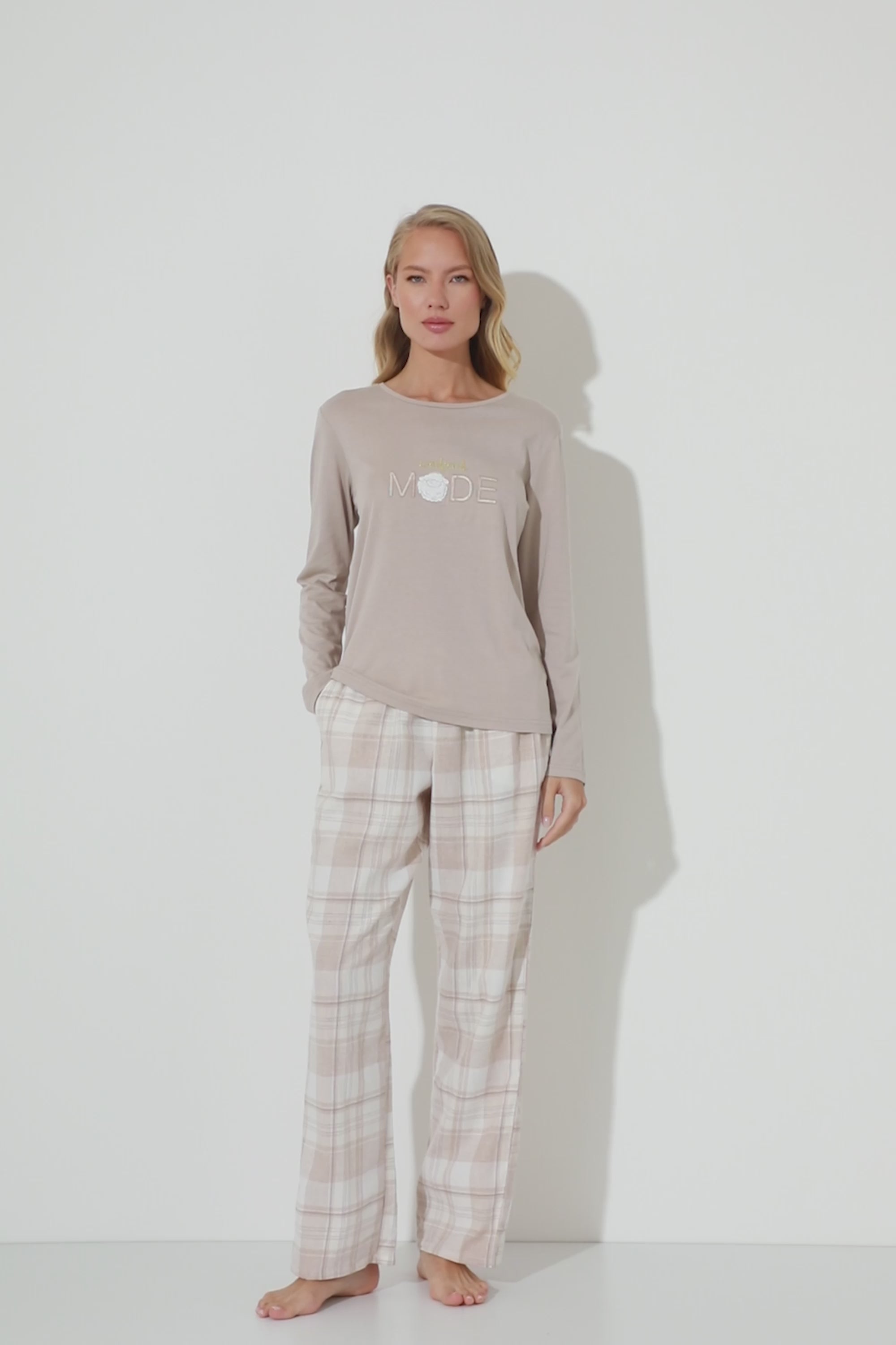 - Do kompletu klasyczne spodnie z miękkiej bawełny, ozdobione ponadczasowym wzorem w kratkę oraz wyposażone w praktyczne kieszenie – kwintesencja wygody i stylu.