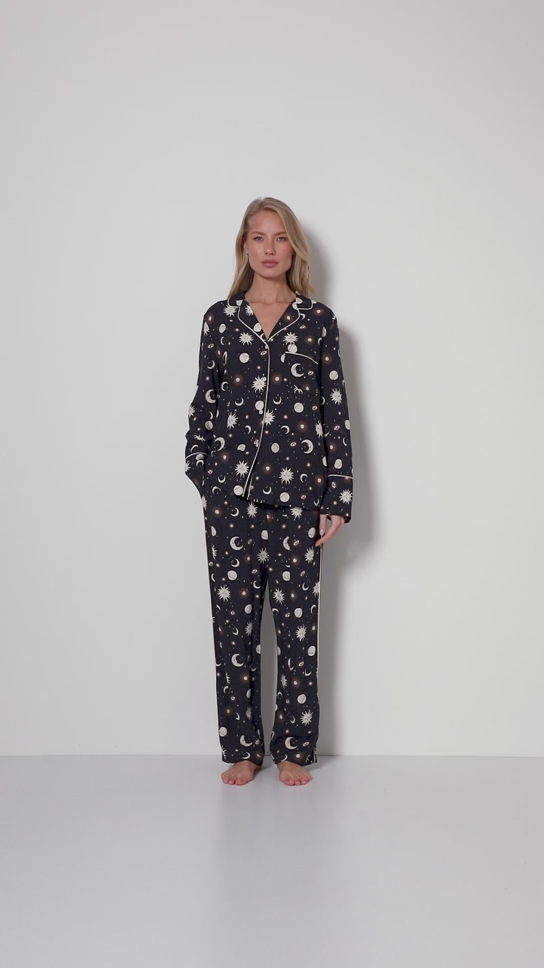 Komplet piżamowy o klasycznym kroju ze spodniami, z ciemnoniebieską bazą i wzorem inspirowanym gwiazdami oraz galaktyką w odcieniach beżu i złota.