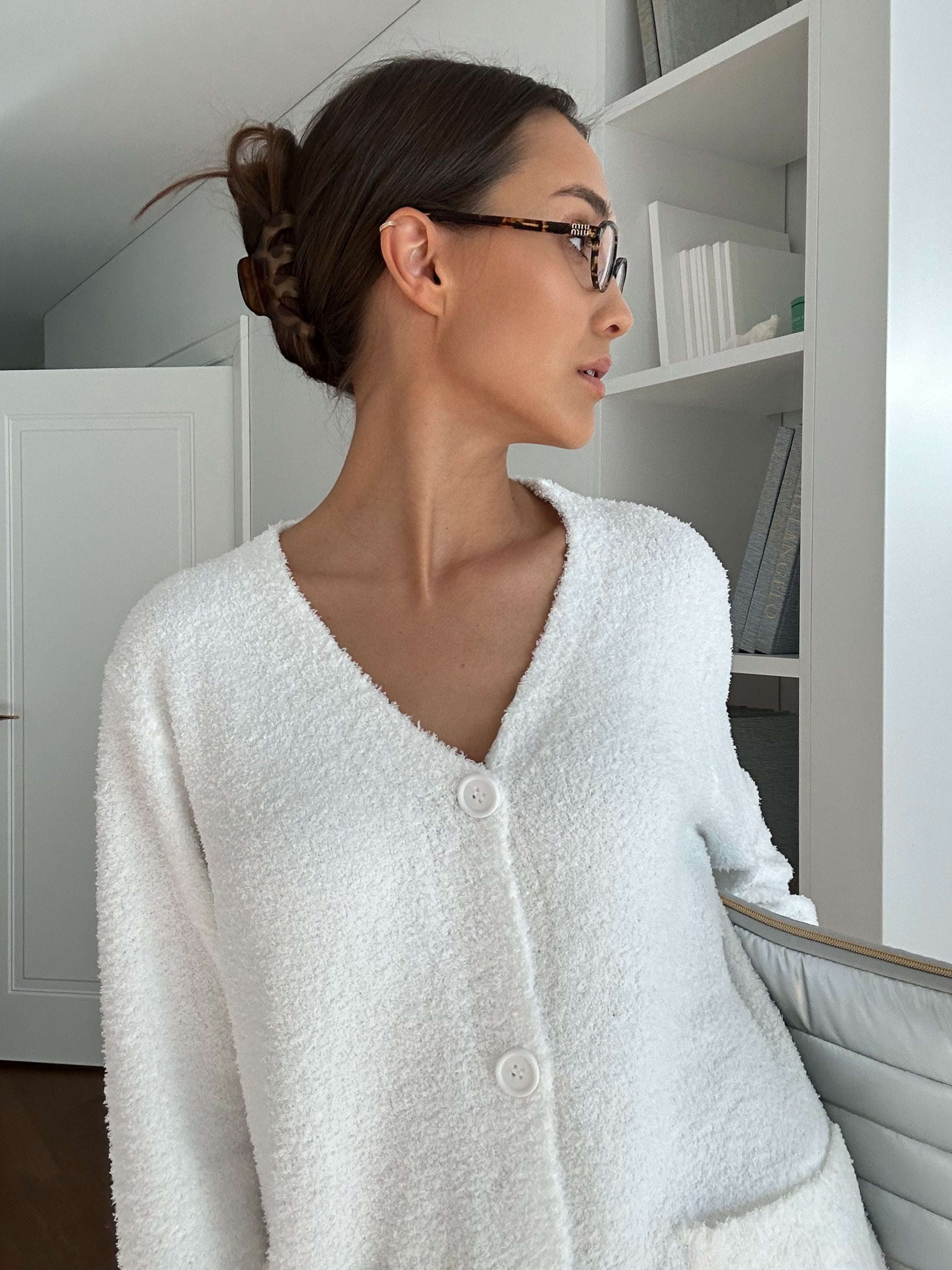 • W połączeniu ze spodniami ten biały zestaw daje ukojenie i miękkość przypominającą owczą wełnę.