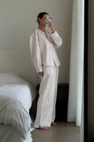 Klasyczny i romantyczny komplet piżamowy ze spodniami, z jasnoróżowym tłem i wyrazistymi różowymi paskami.