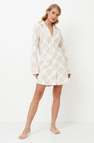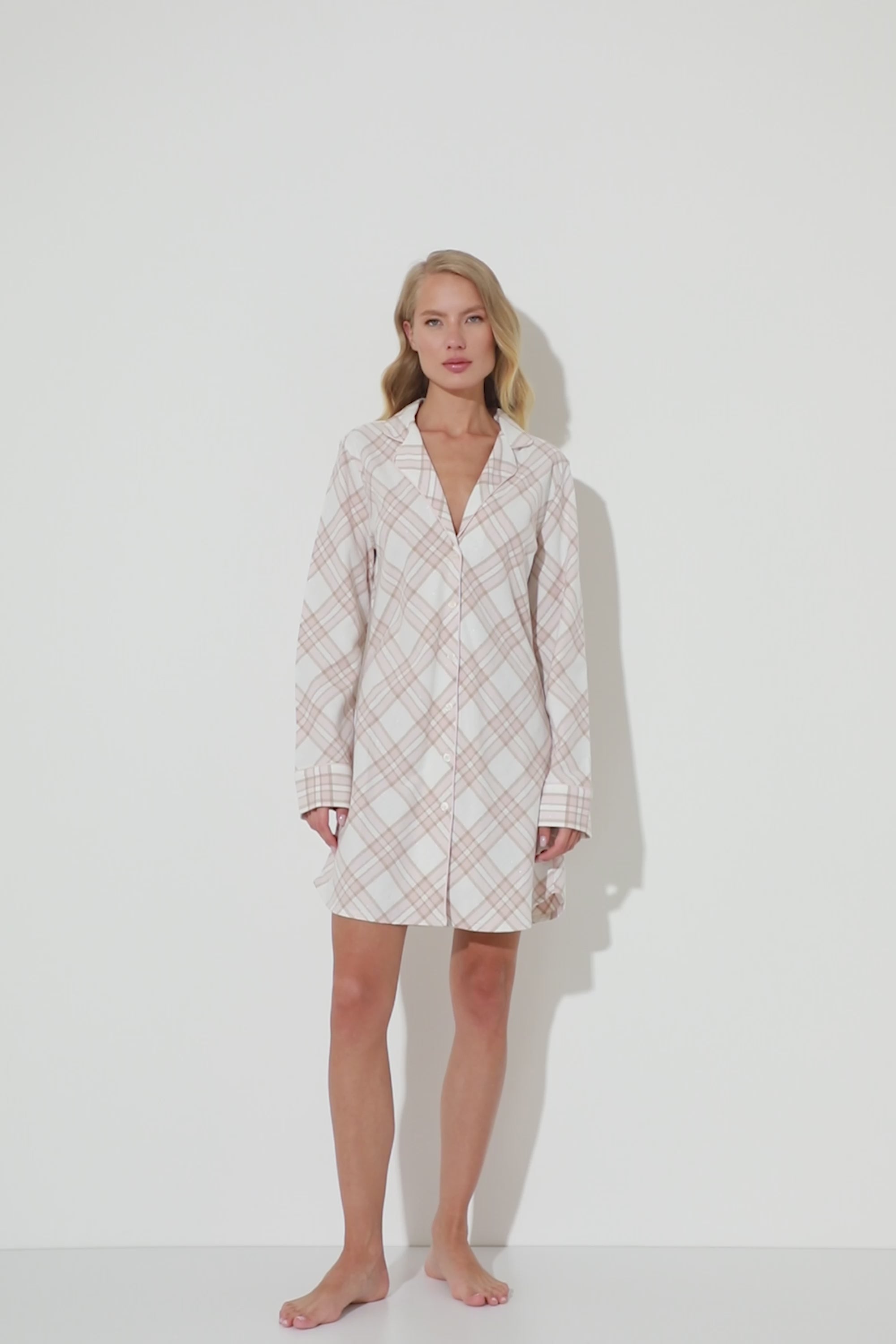 • Długa koszula nocna z długim rękawem posiada kołnierzyk w kształcie litery V, lamówki na kołnierzu i mankietach oraz subtelny haft „Dream” na tylnej części kołnierza, który dodaje elegancji.