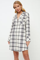 • Sukienka z długim rękawem ma dekolt w serek, zapinana jest na guziki z przodu, posiada mankiety oraz kieszonkę na piersi, a wszystko podkreślone elegancką lamówką.