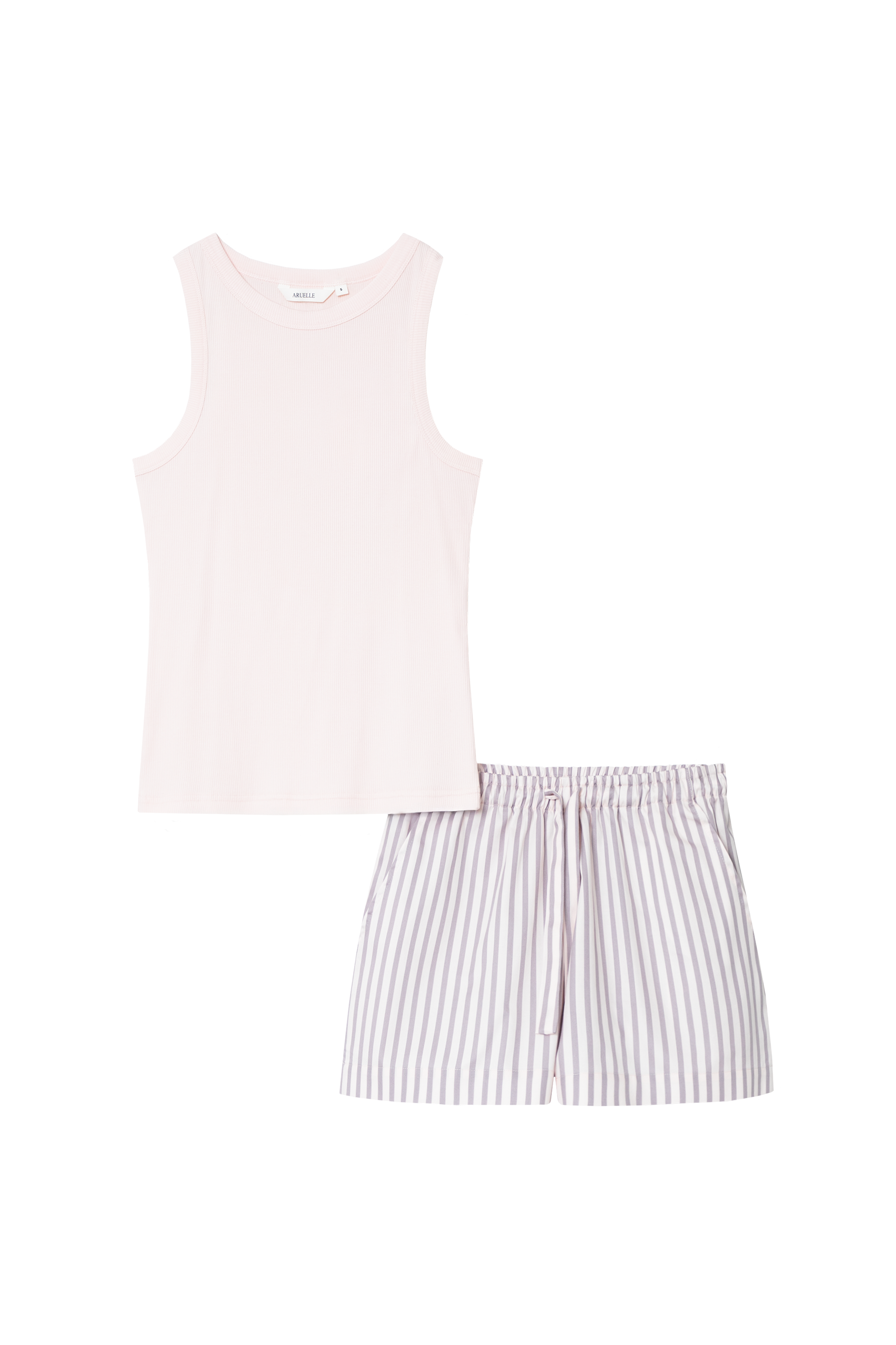 Miękki i nowoczesny, ten jasnoróżowy komplet w paski doskonale sprawdzi się podczas ciepłych nocy i spokojnych poranków.