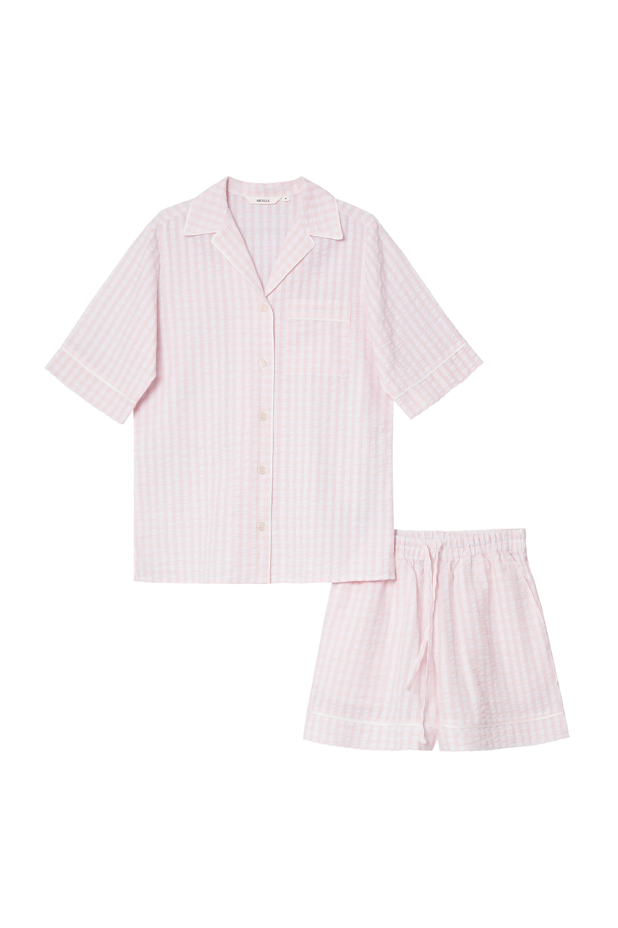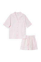 Miękki i klasyczny, ten jasnoróżowy komplet piżamowy został stworzony z myślą o niewymuszonym komforcie w cieplejsze dni.