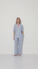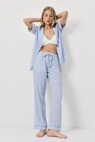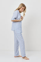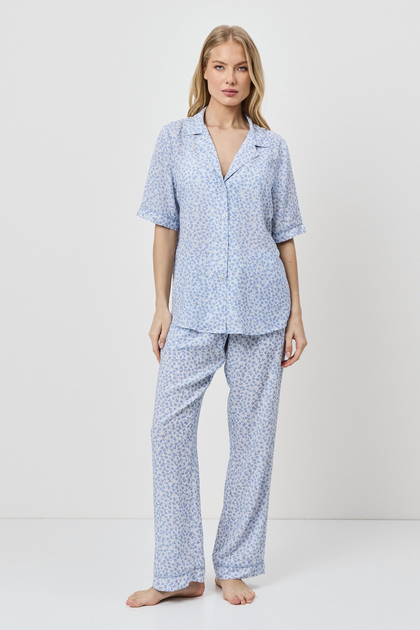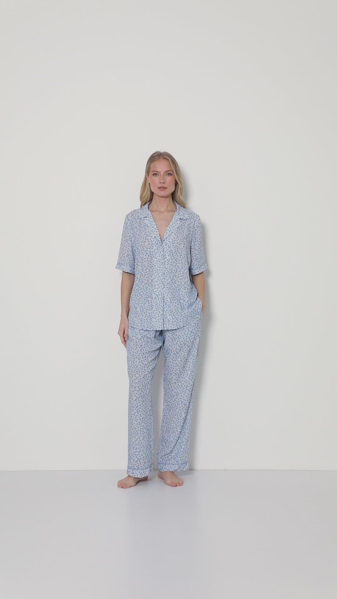 Dwuczęściowy komplet piżamowy składający się z koszuli z krótkim rękawem zapinanej na guziki oraz spodni o pełnej długości.