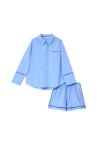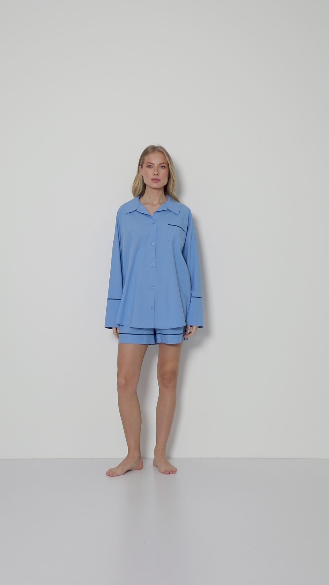 Wyrazisty i minimalistyczny, ten komplet piżamowy łączy dopracowany krój z nowoczesną, swobodną linią.