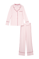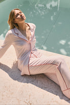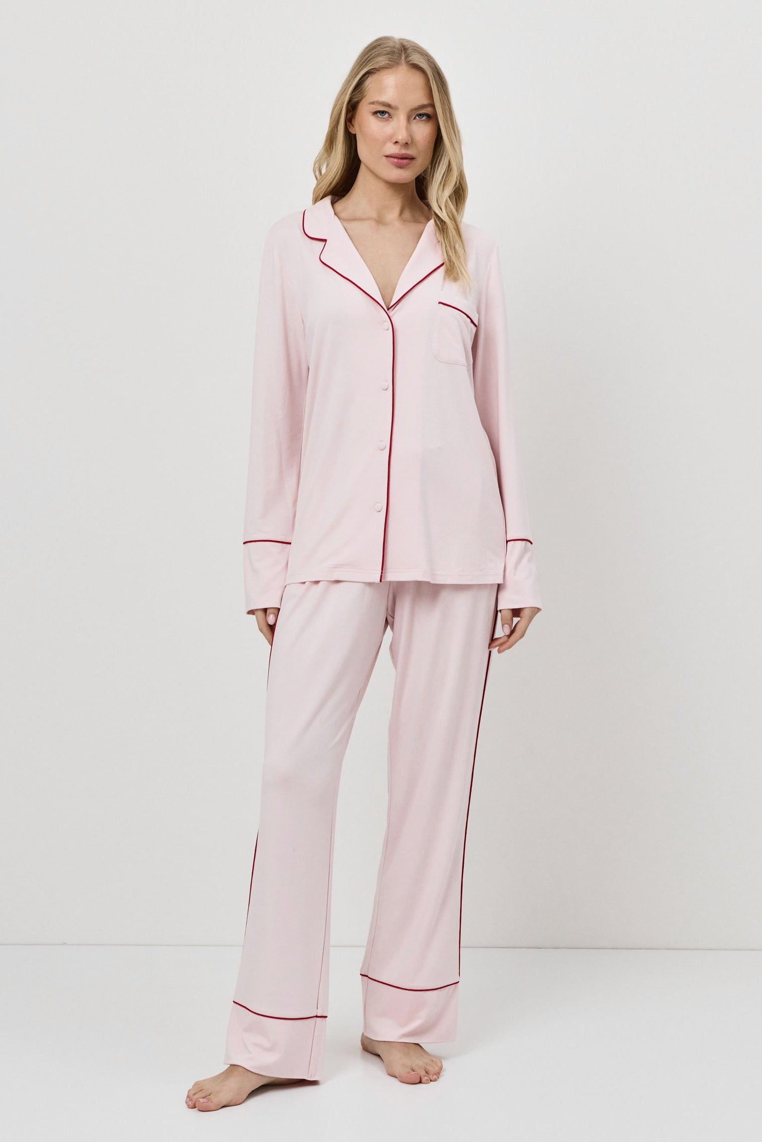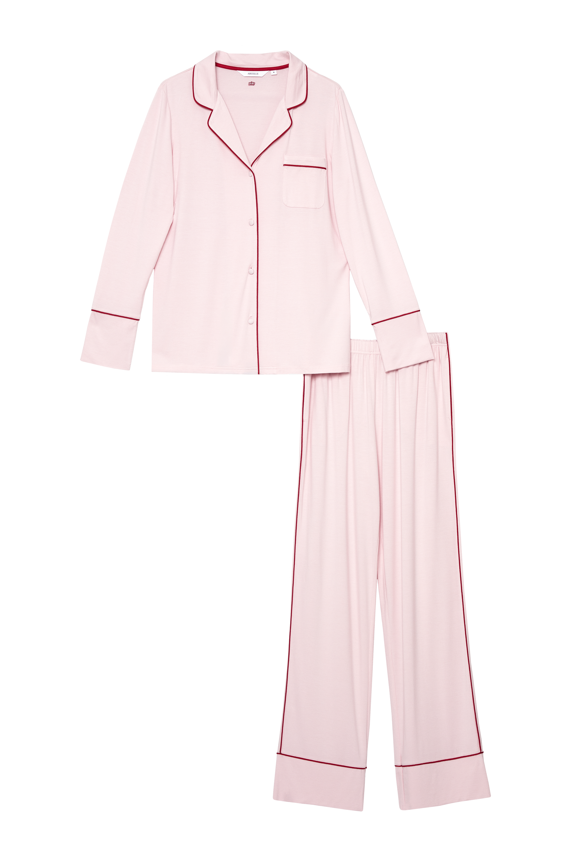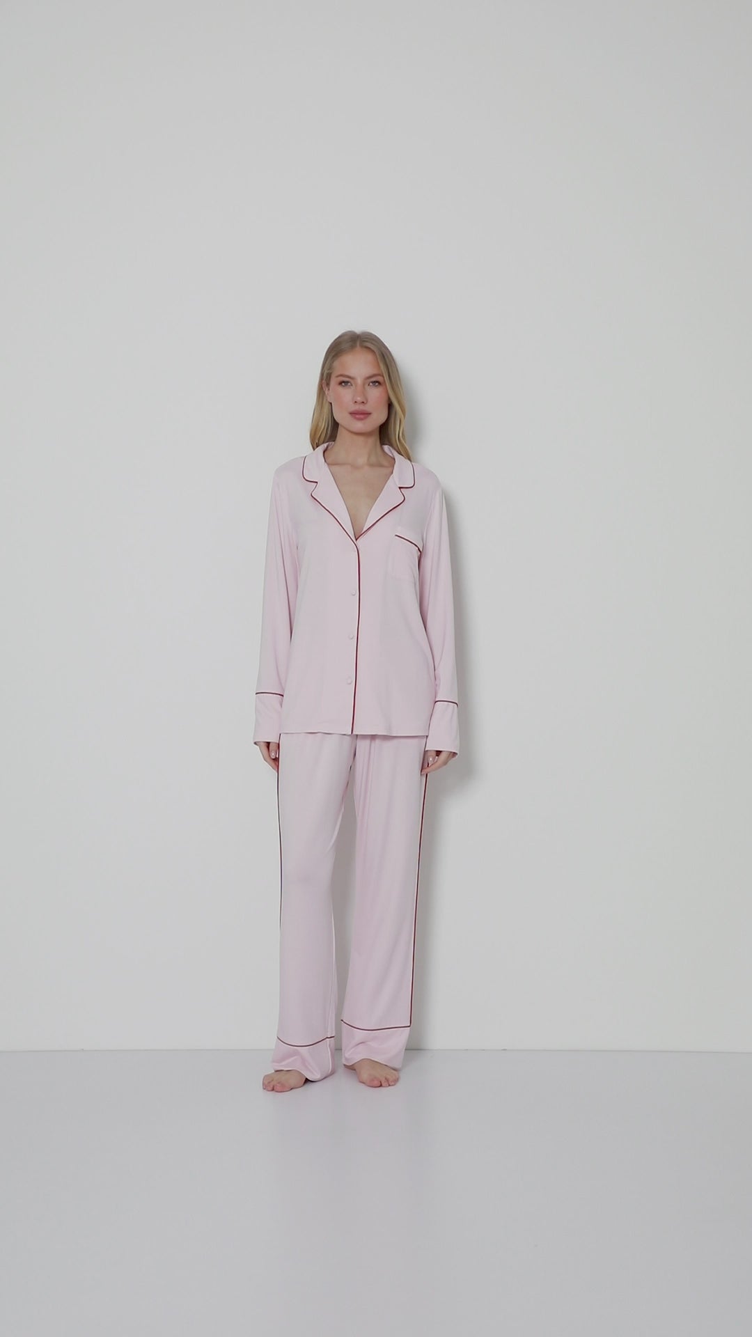 Miękki i elegancki, ten różowy komplet piżamowy został zaprojektowany z myślą o przytulnych nocach i wyrafinowanym komforcie.