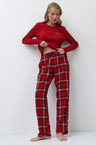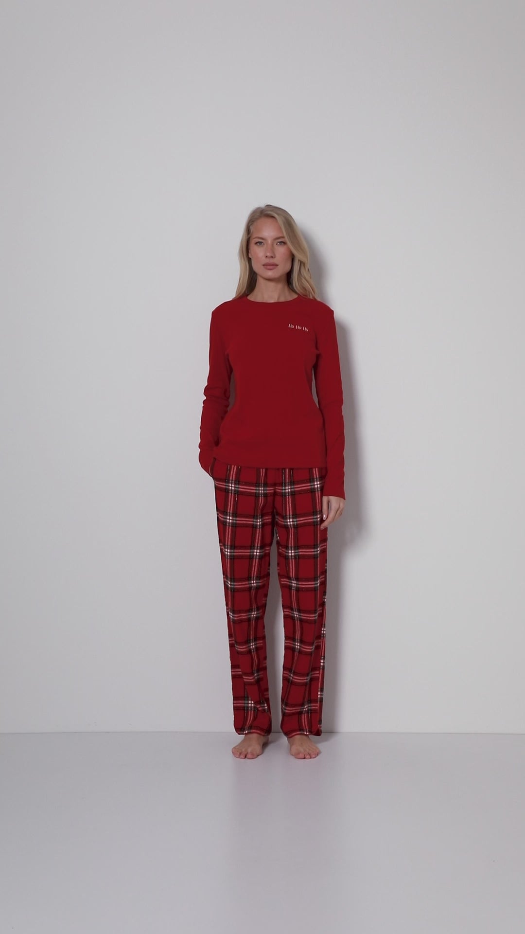 - Długie czerwone spodnie w kratę z zaokrąglonym dołem, kieszeniami po bokach oraz kwadratową kieszenią z tyłu.