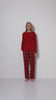 Czerwona, dzianinowa góra z zaokrąglonym kołnierzykiem i długimi rękawami.