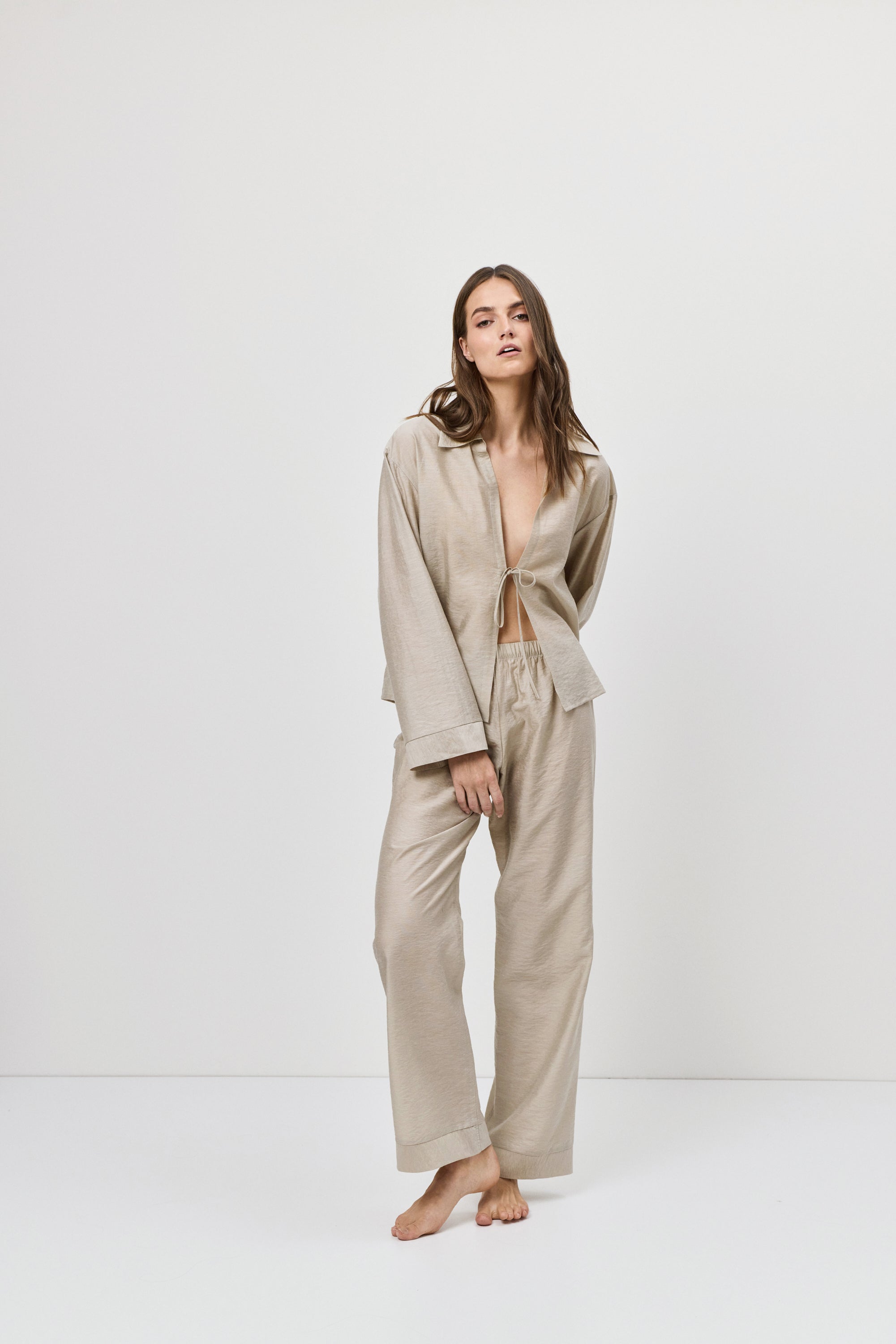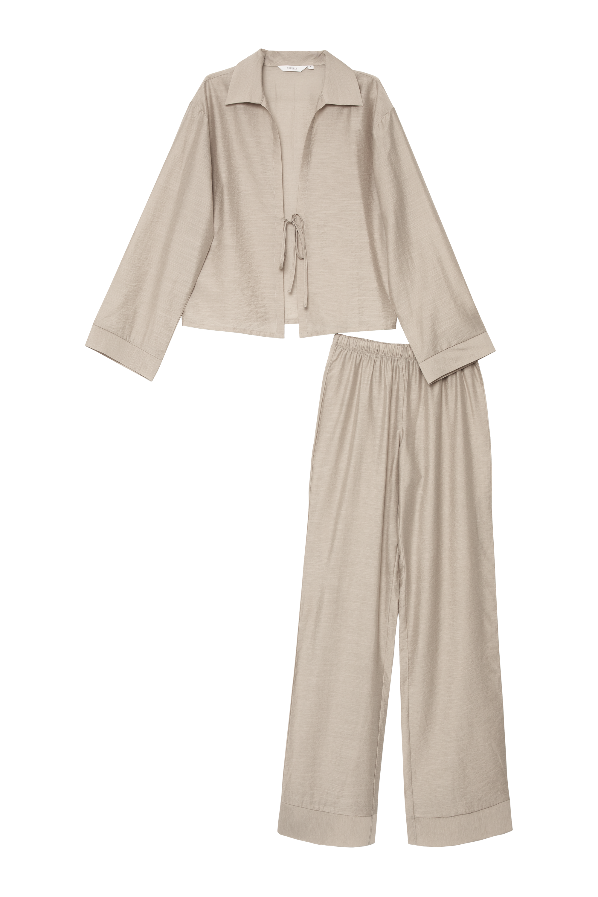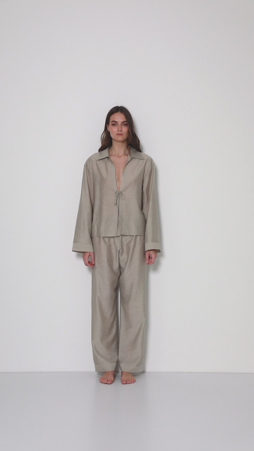 - Zestaw składa się z topu z długim rękawem i otwartym kołnierzem, wiązanego z przodu, oraz luźnych spodni o pełnej długości.