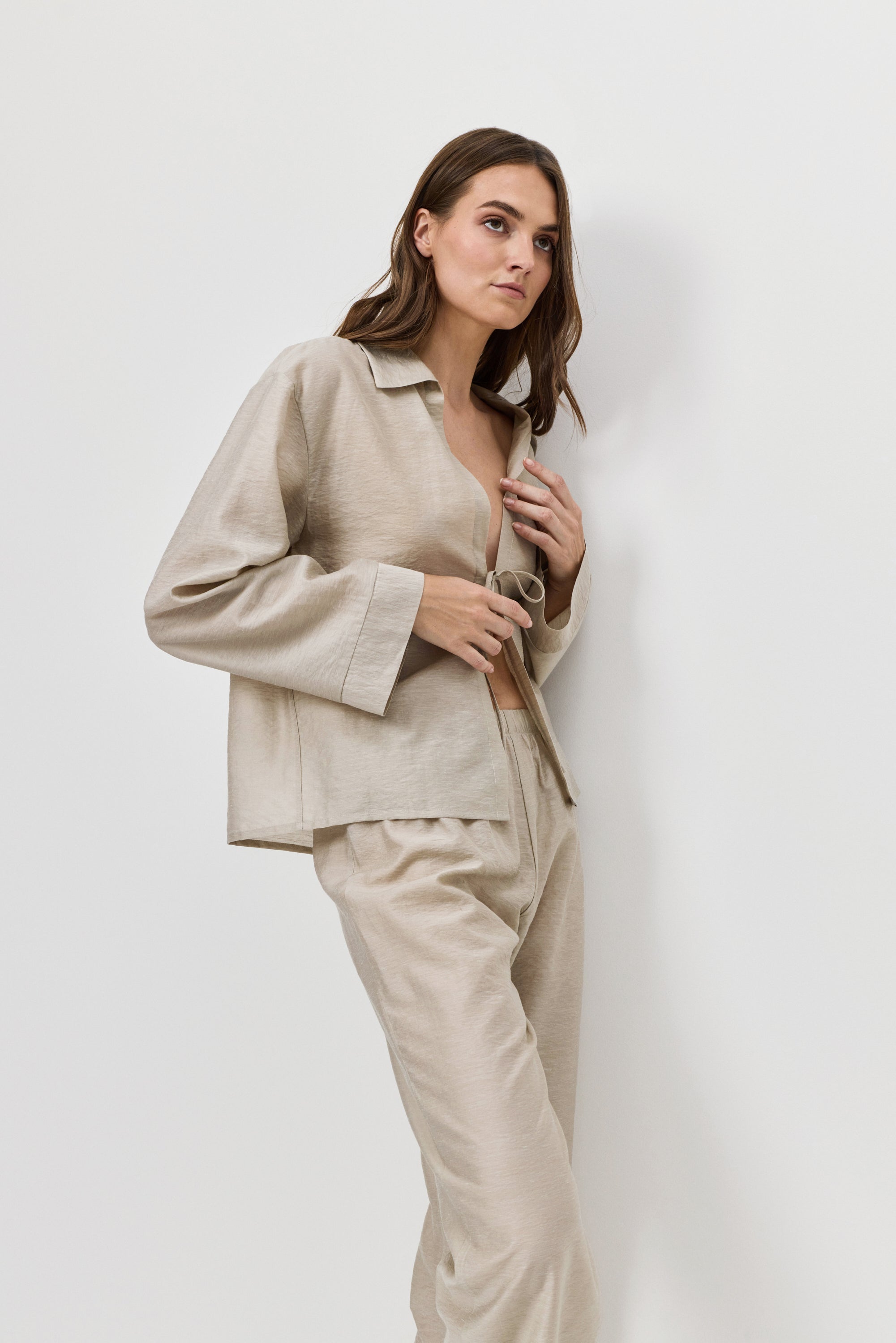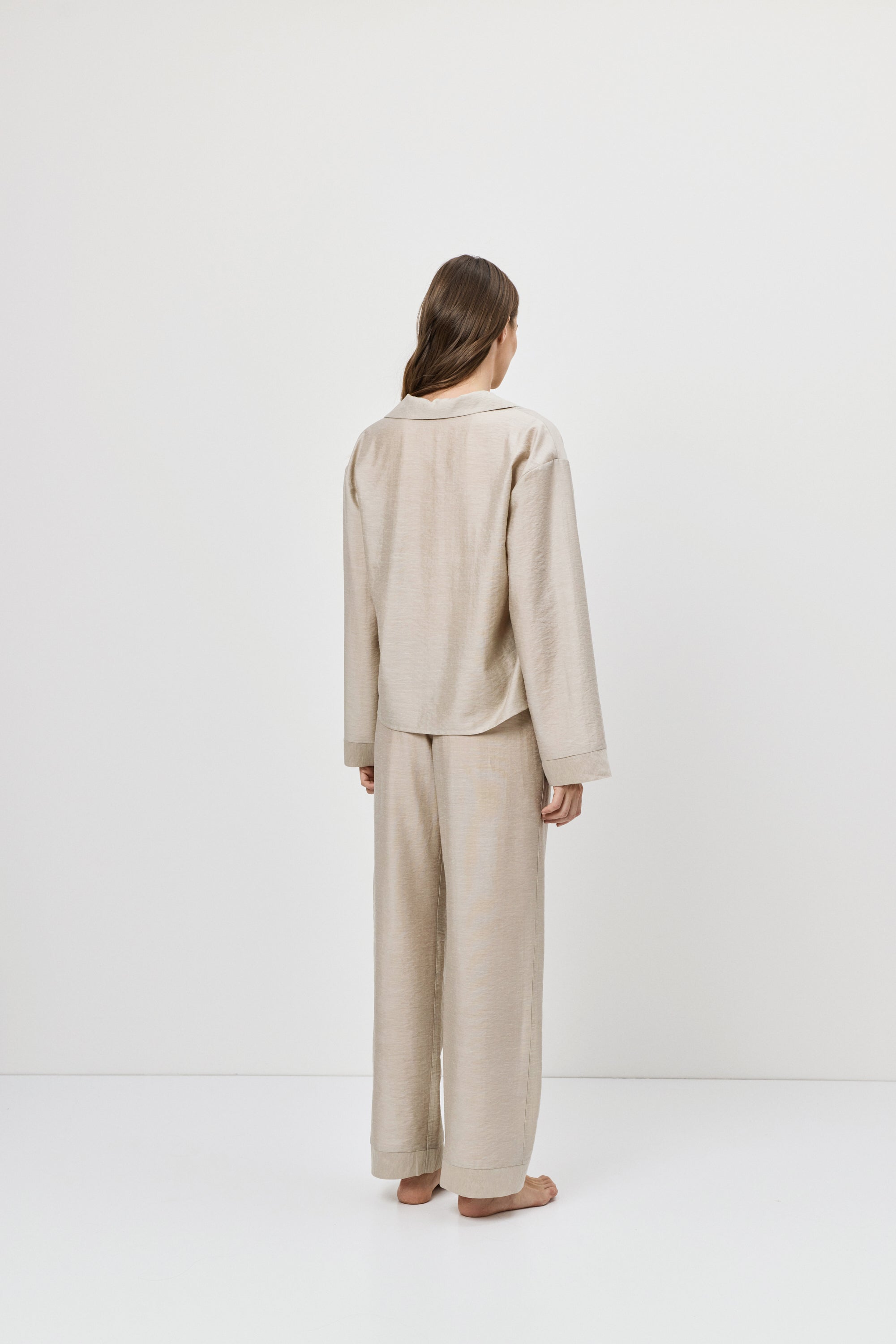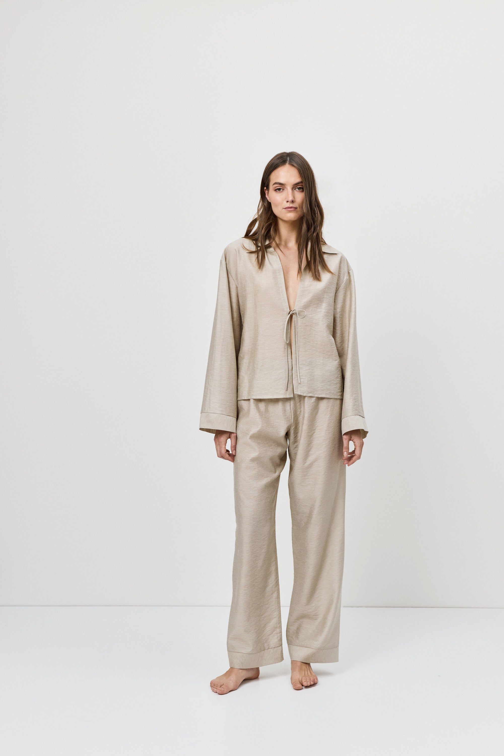- Zestaw składa się z topu z długim rękawem i otwartym kołnierzem, wiązanego z przodu, oraz luźnych spodni o pełnej długości.