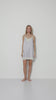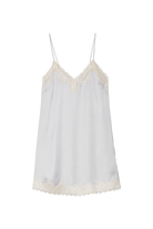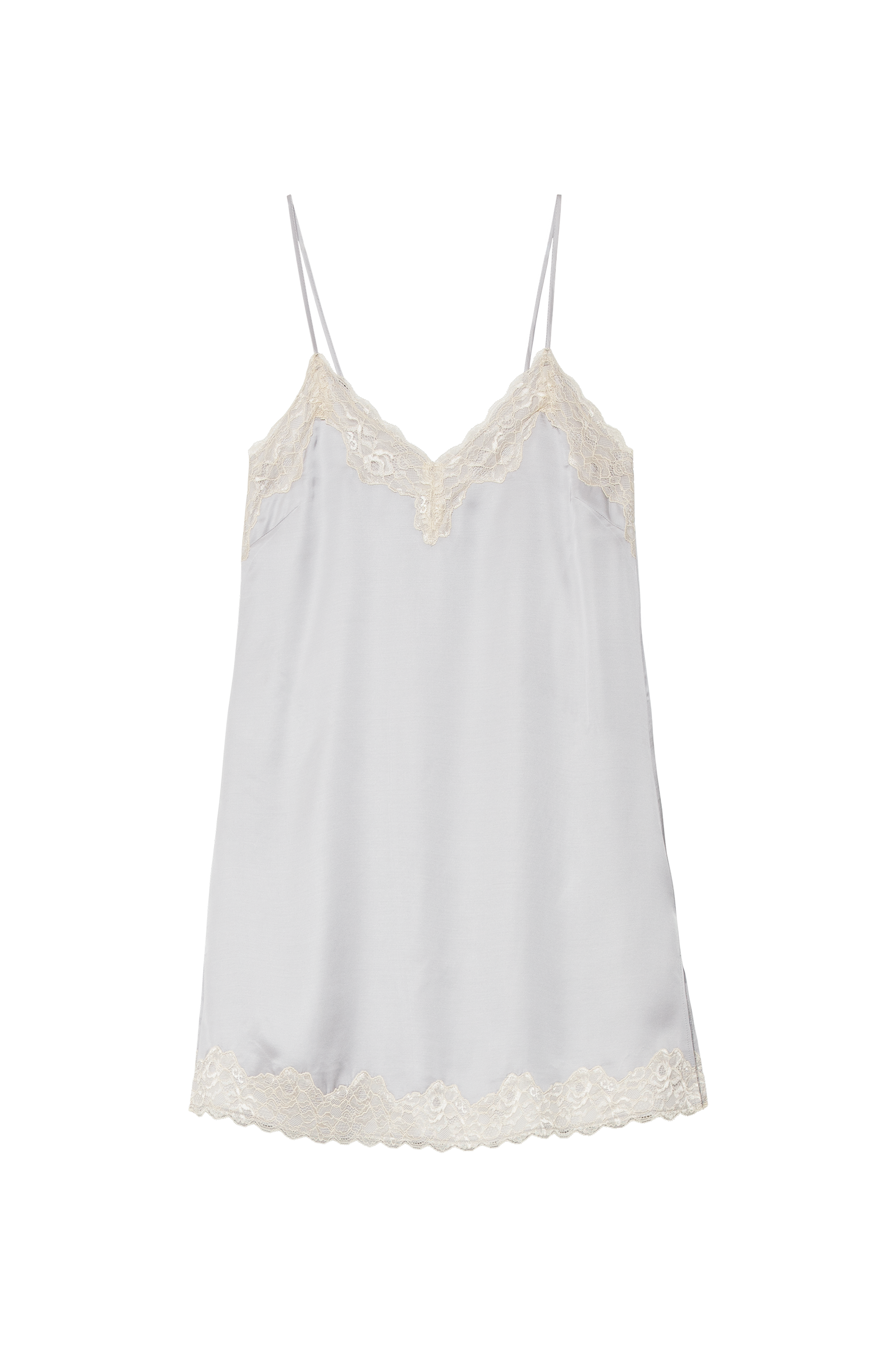 - Delikatny srebrzysty odcień dopełniają akcenty z koronką w kolorze kości słoniowej przy dekolcie oraz u dołu.