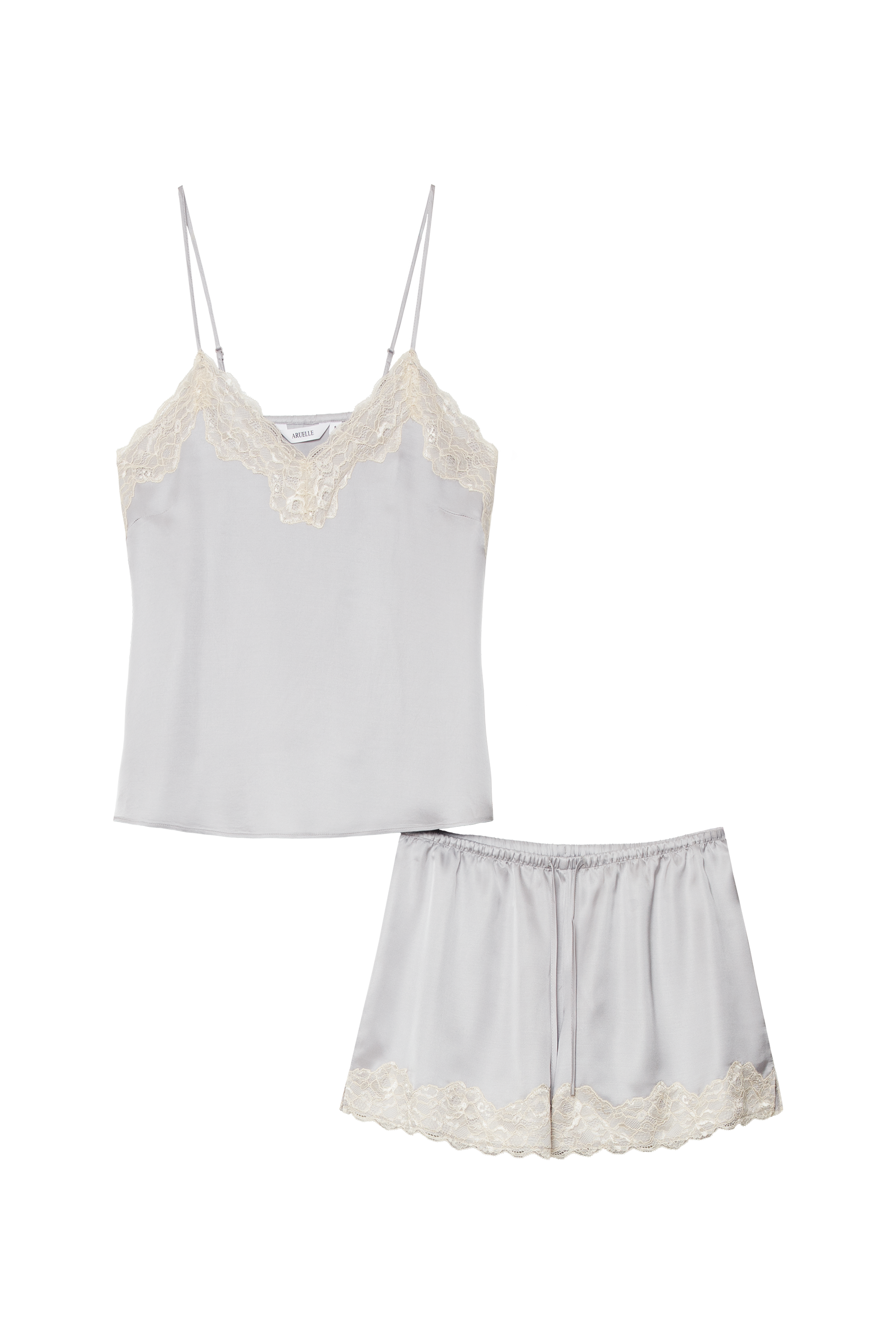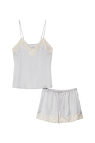 - Zestaw składa się z topu typu camisole oraz dopasowanych szortów, wykończonych subtelną koronką w odcieniu kości słoniowej.