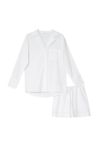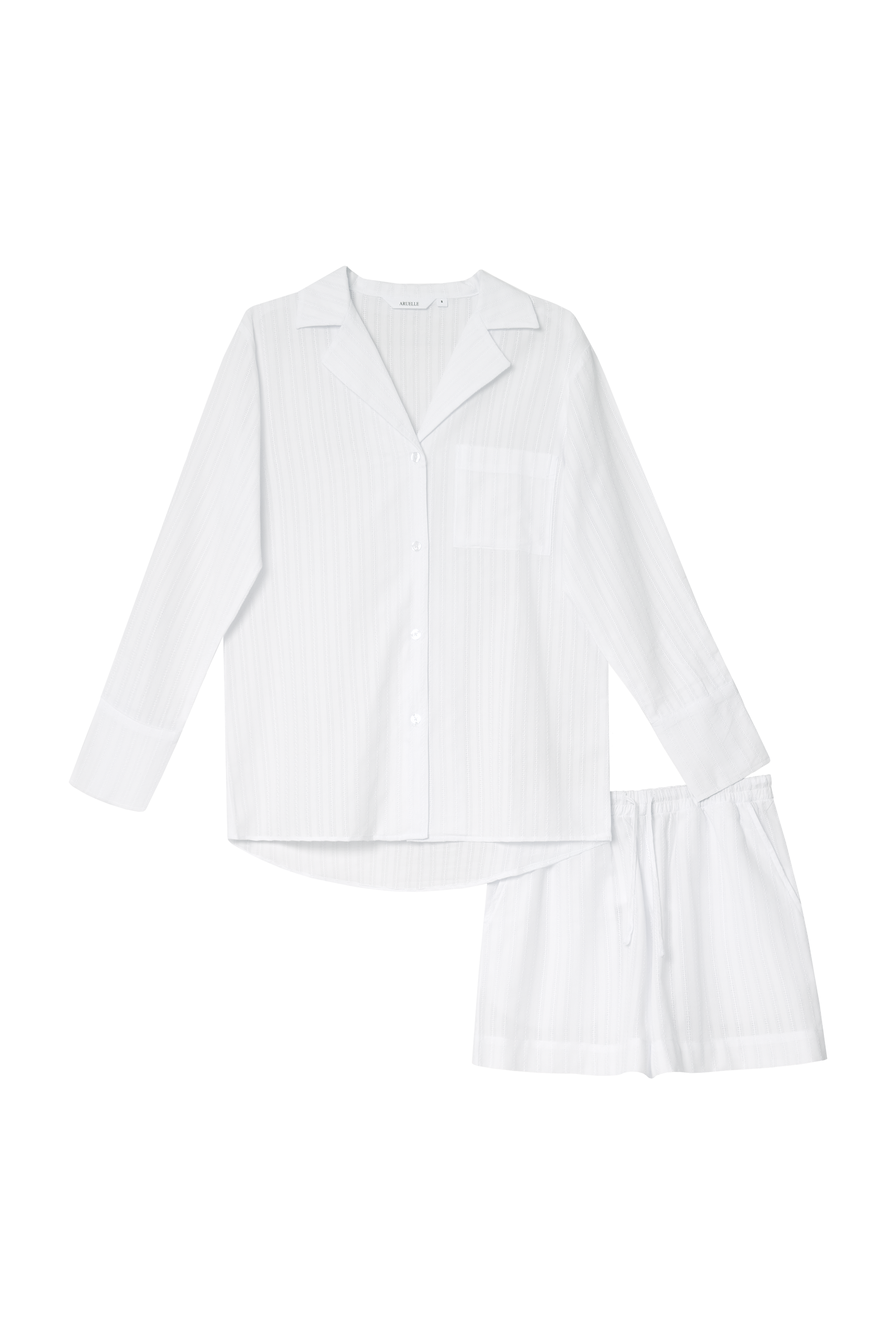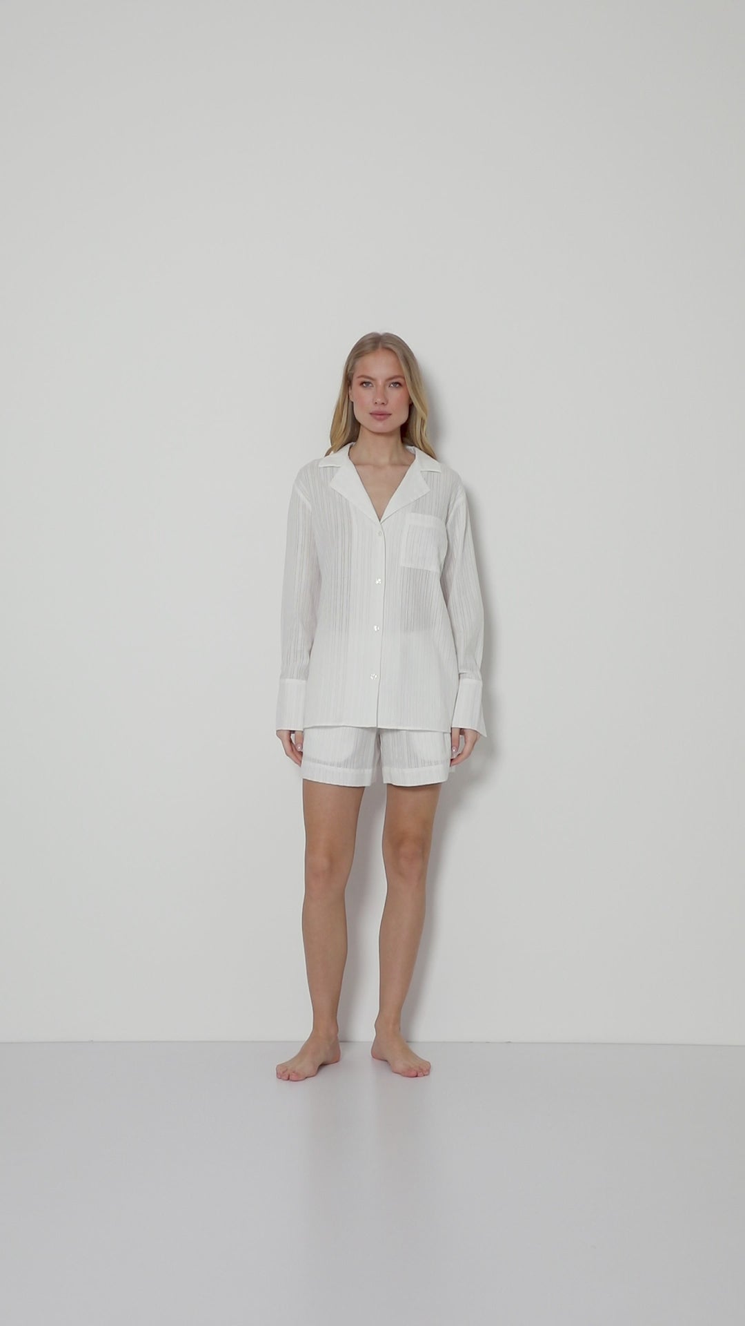 - Zestaw składa się z koszuli z długim rękawem zapinanej na guziki oraz szortów o luźnym kroju.