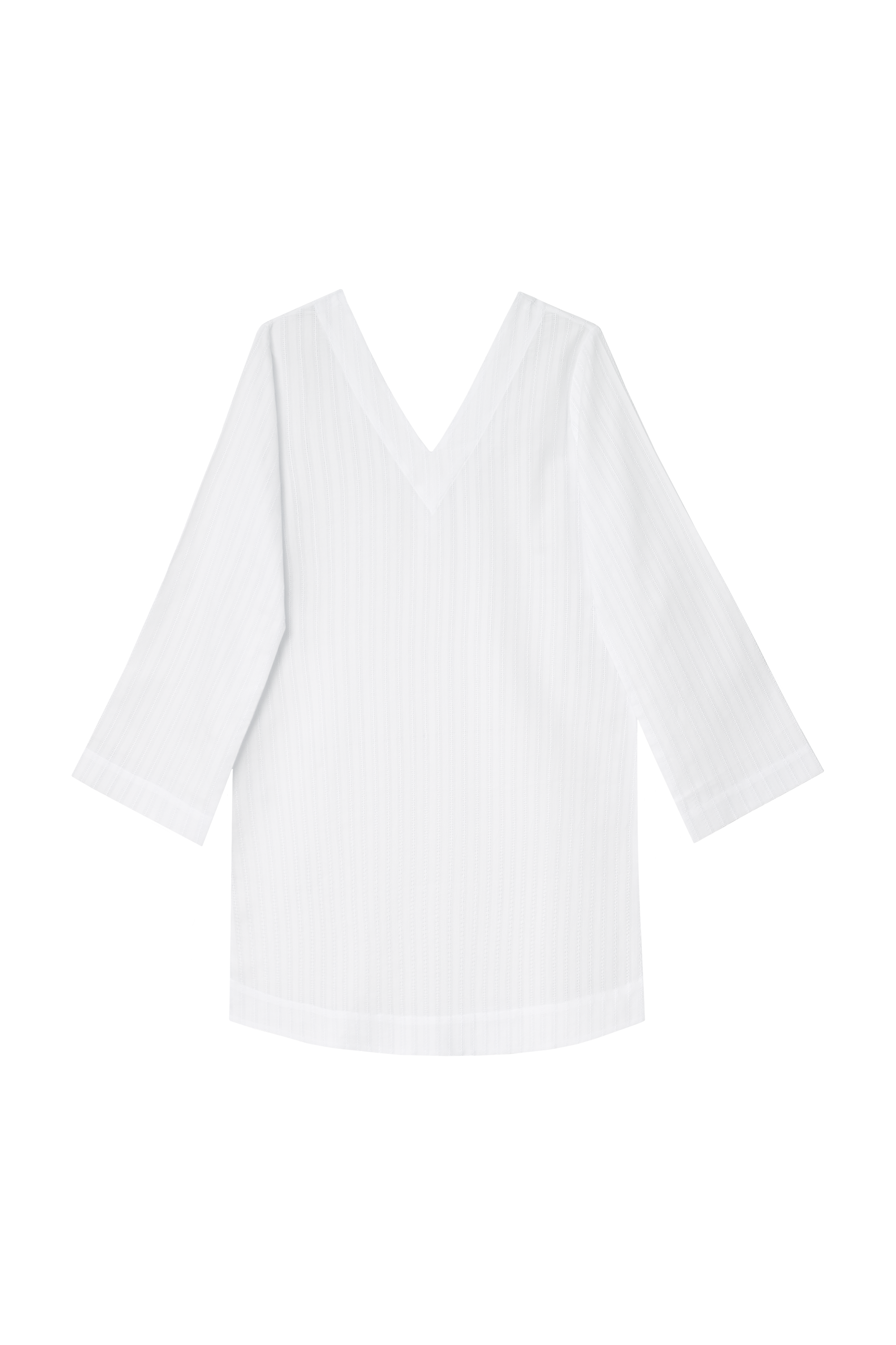 - Model posiada kobiecy dekolt w kształcie litery V z przodu i z tyłu, długie rękawy oraz luźną, swobodną sylwetkę, która zapewnia komfort i lekkość noszenia.