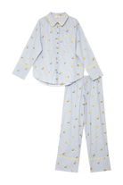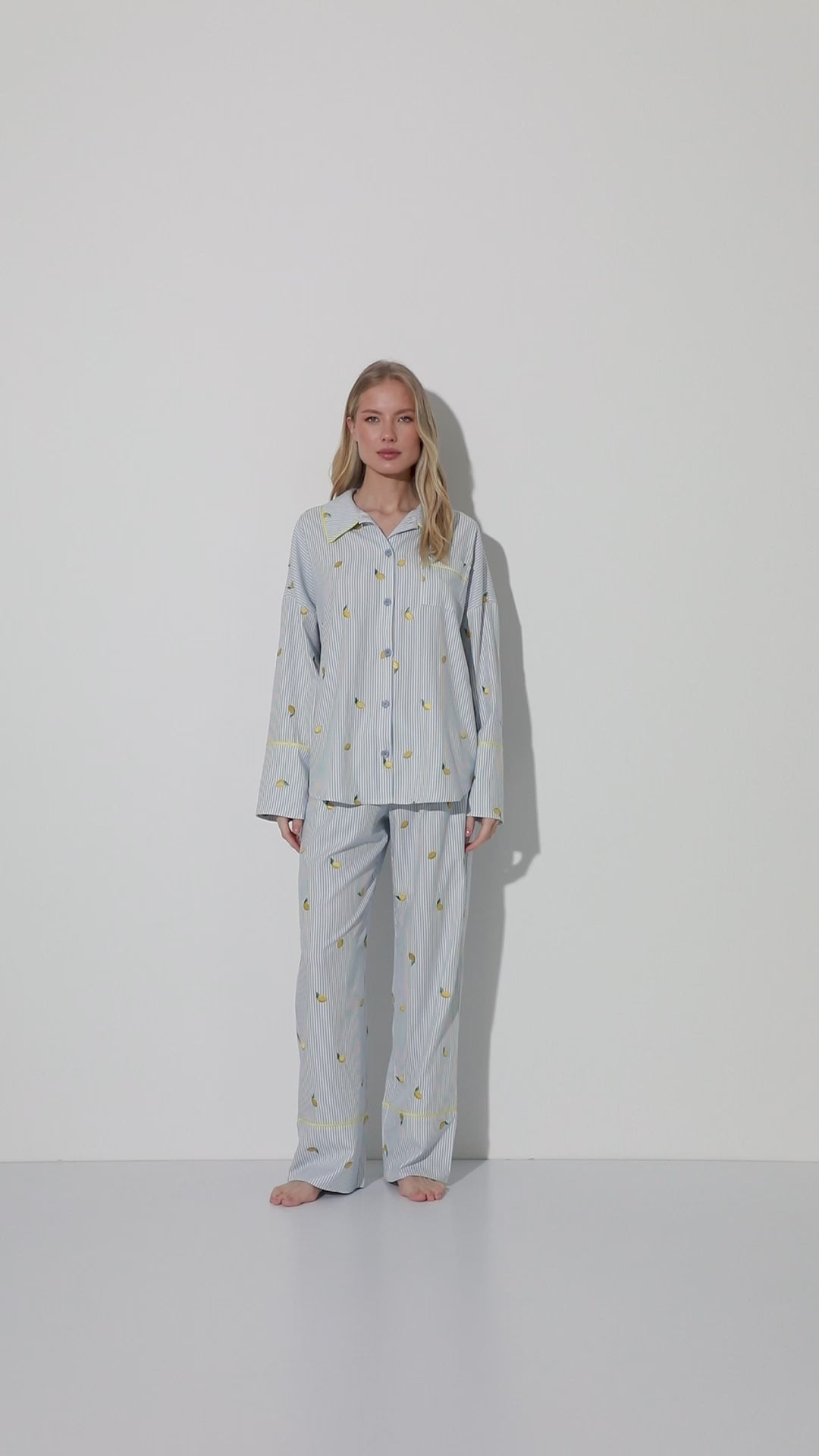 Uroczy i świeży, ten długi komplet piżamowy został wykonany z tkaniny z haftowanym motywem cytryn, nadając całości lekko zabawnego, a zarazem eleganckiego charakteru.