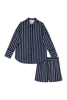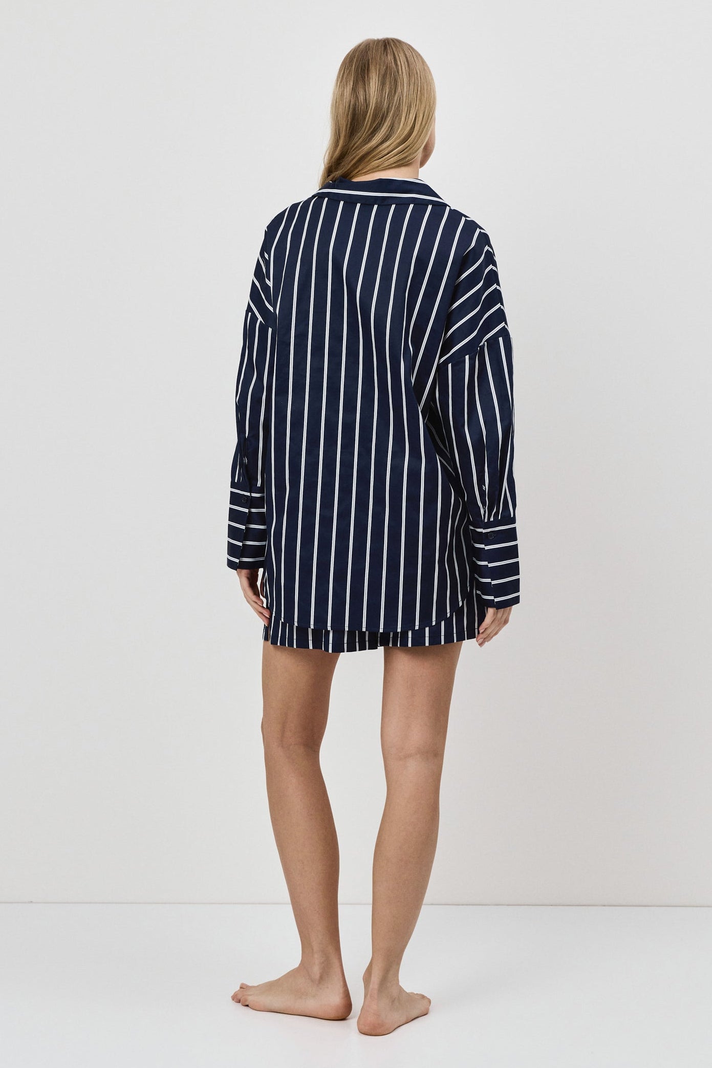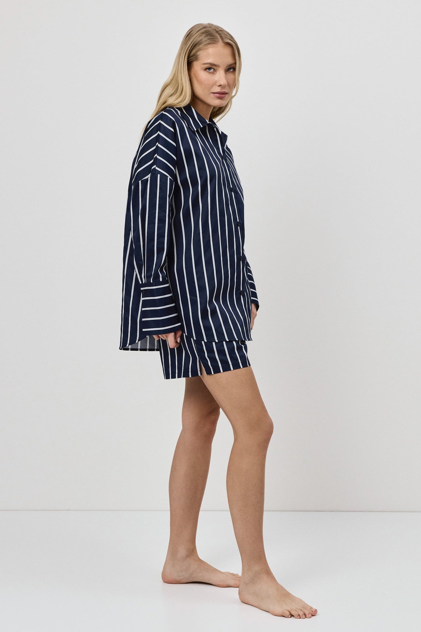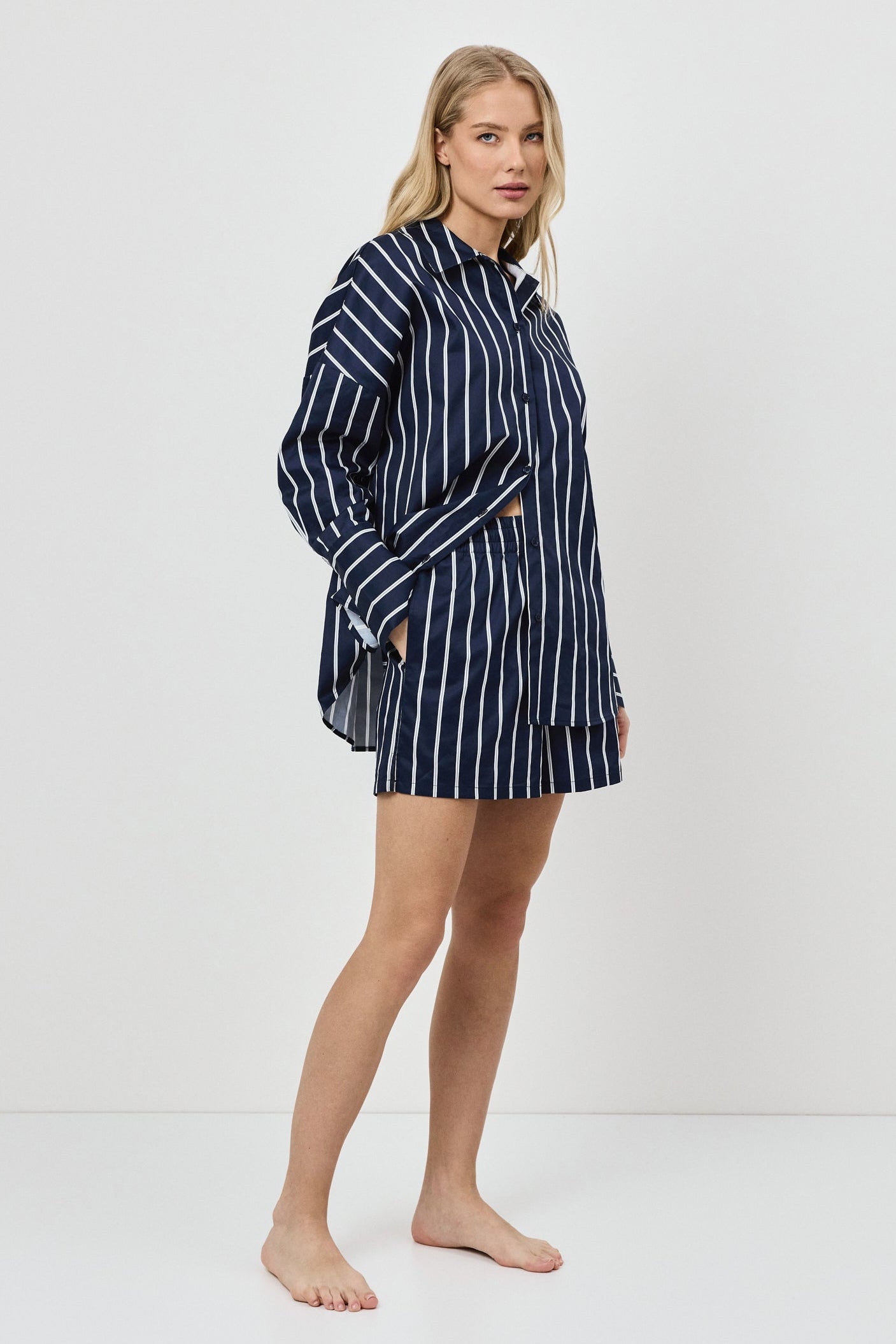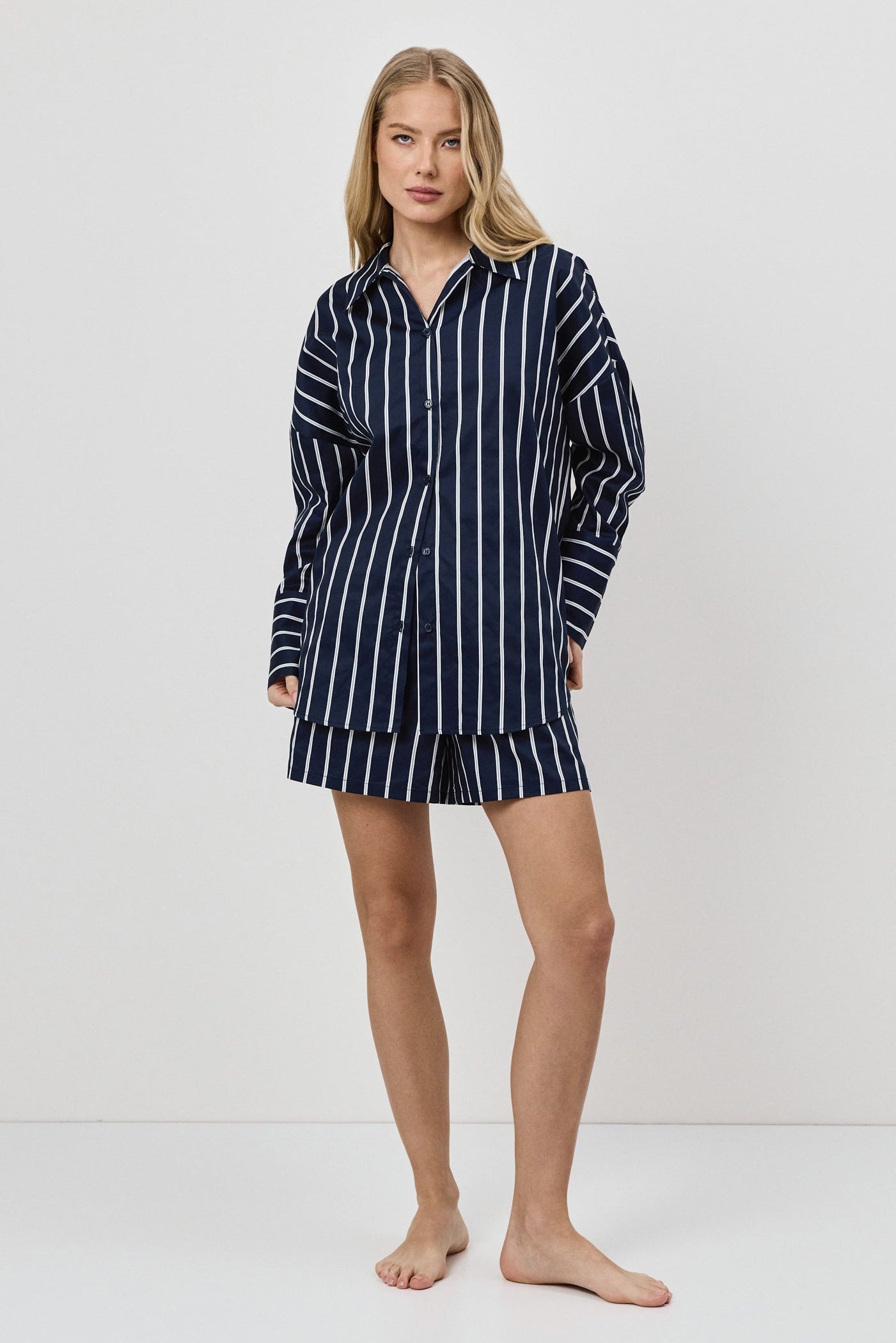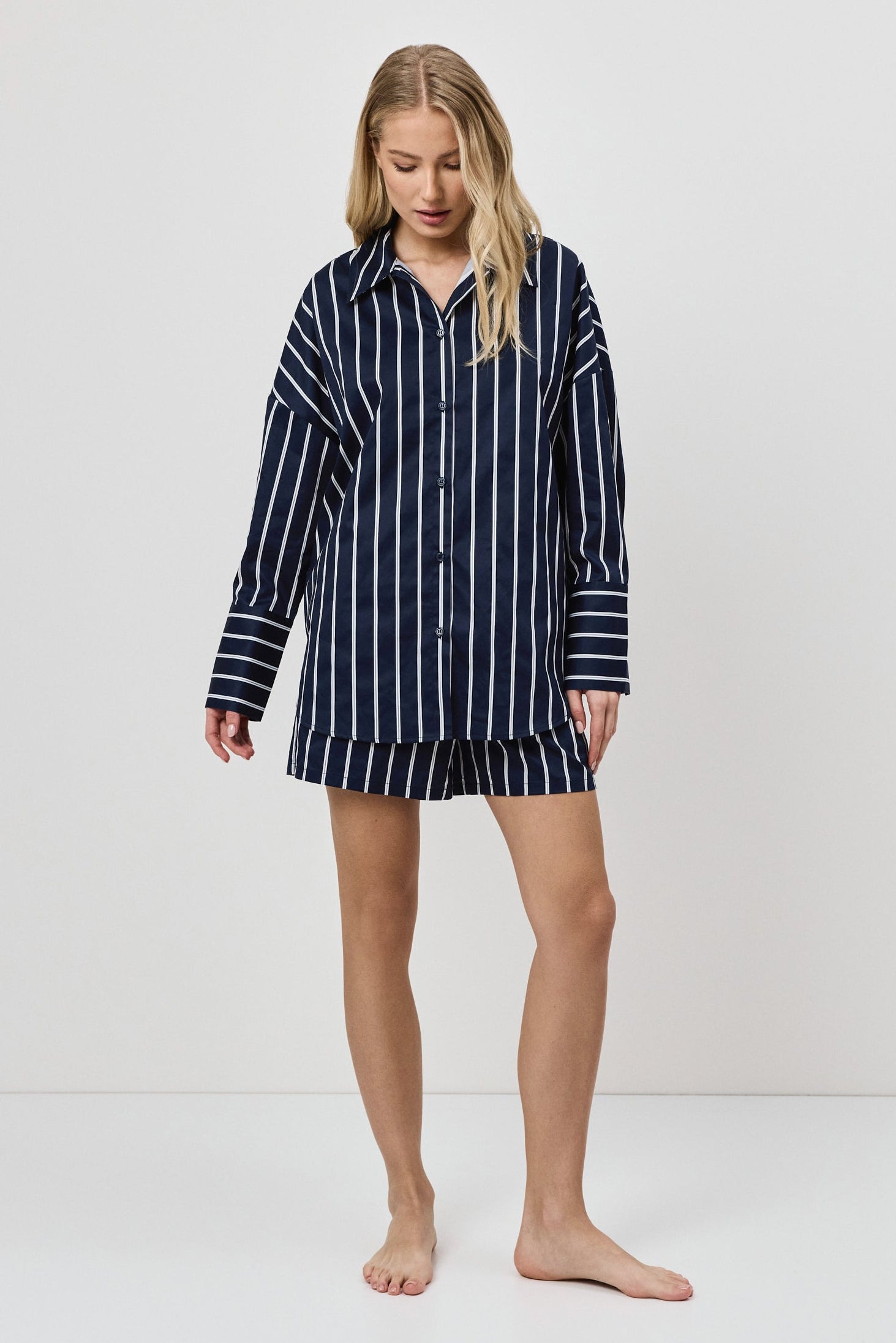 - Zestaw składa się z koszuli z długim rękawem zapinanej na guziki oraz szortów o luźnym kroju.
