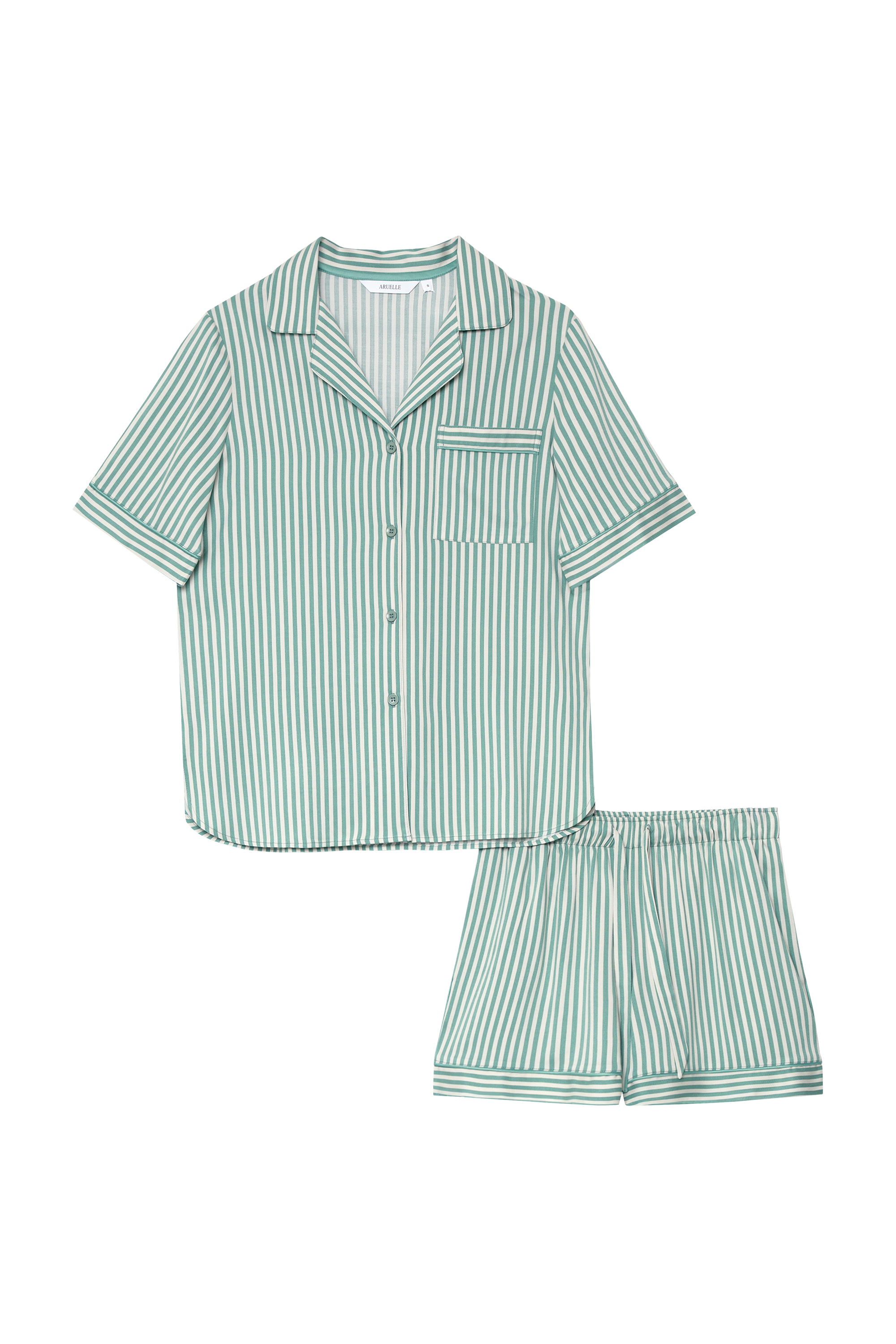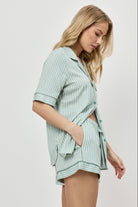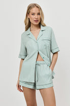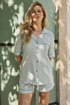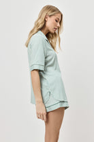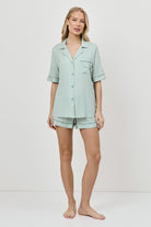 Gładki i elastyczny, ten komplet piżamowy w stonowanej zieleni to idealny wybór na ciepłe noce z nutą elegancji.