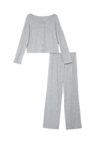 Otulający, dwuczęściowy komplet piżamowy z topem w stylu krótkiego cardigan oraz dopasowanymi spodniami o pełnej długości.