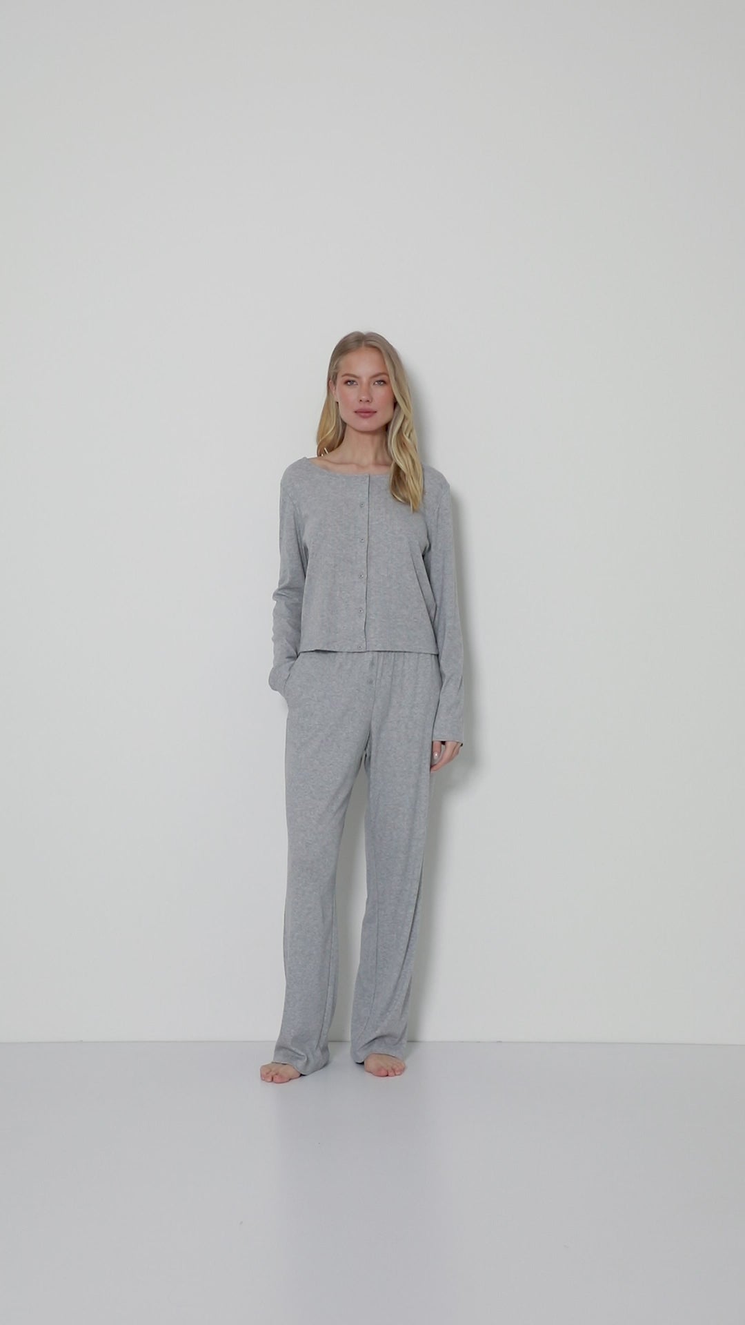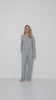 - Jasnoszary odcień melange w połączeniu z subtelną, prążkowaną fakturą i delikatnym wykończeniem brzegów nadaje całości eleganckiej lekkości.