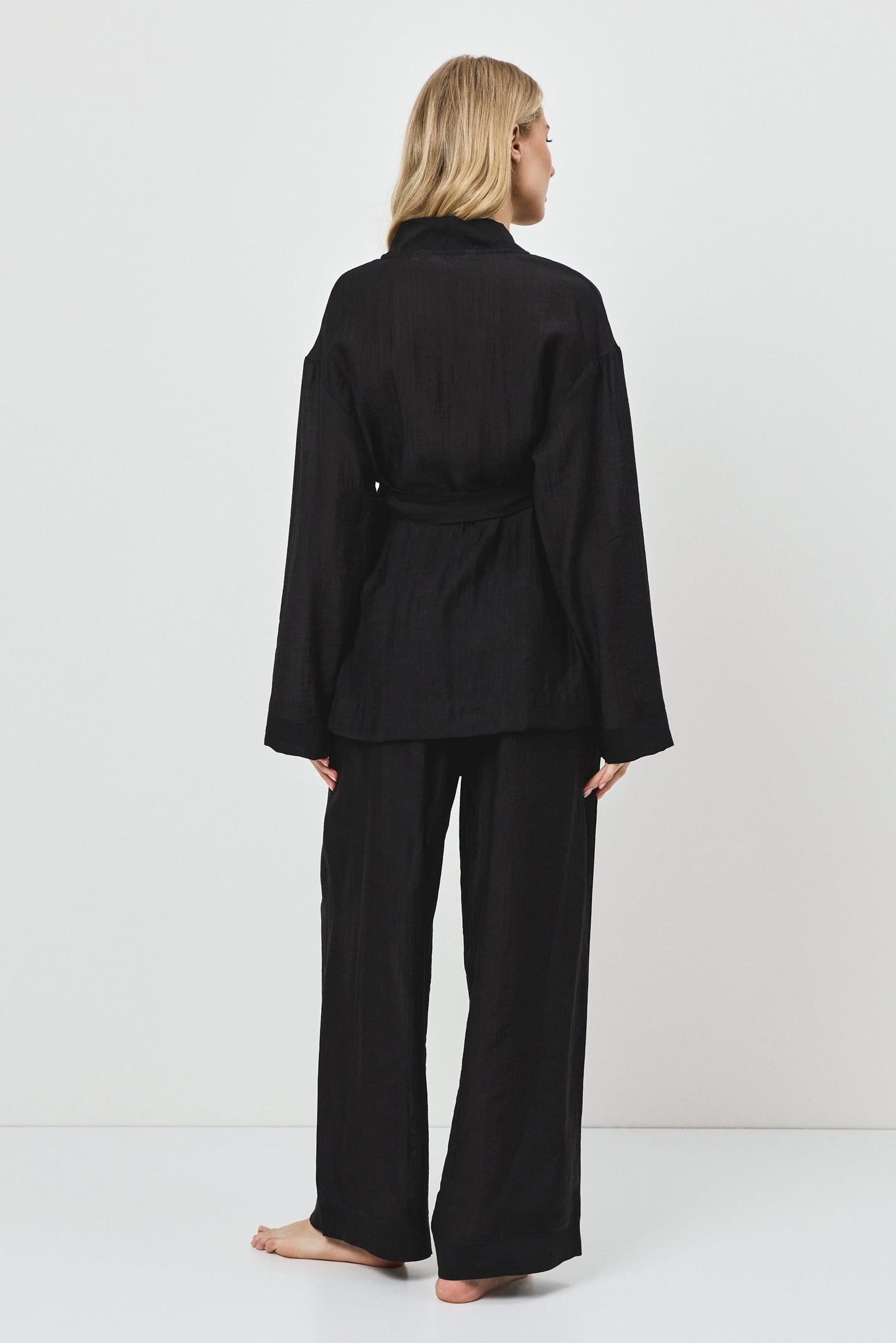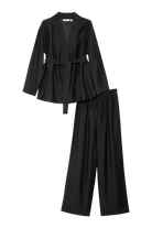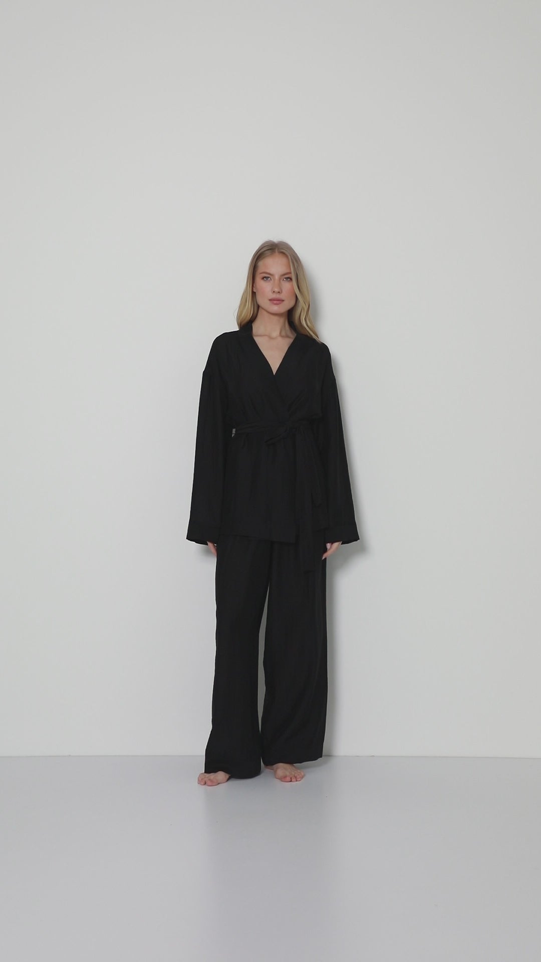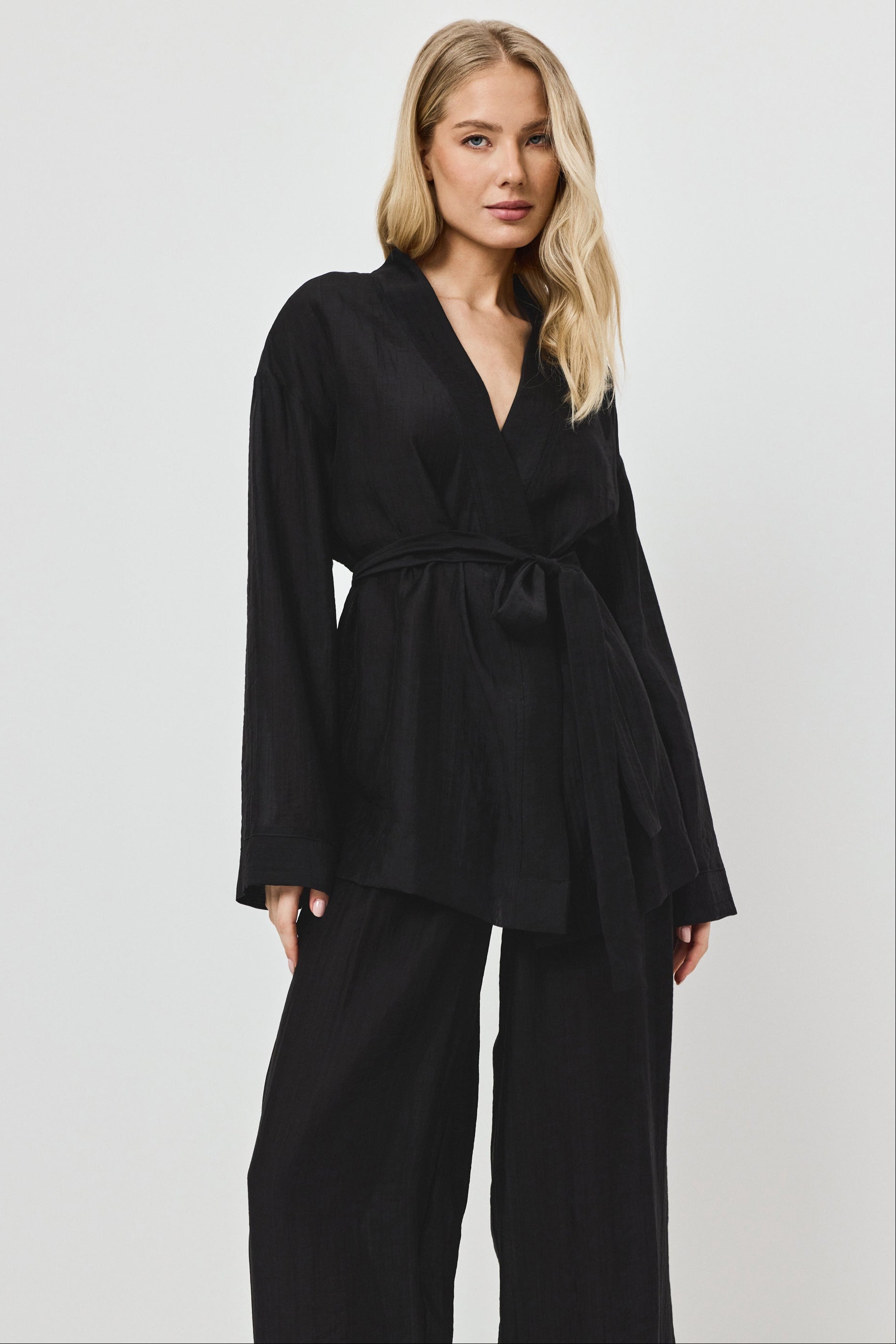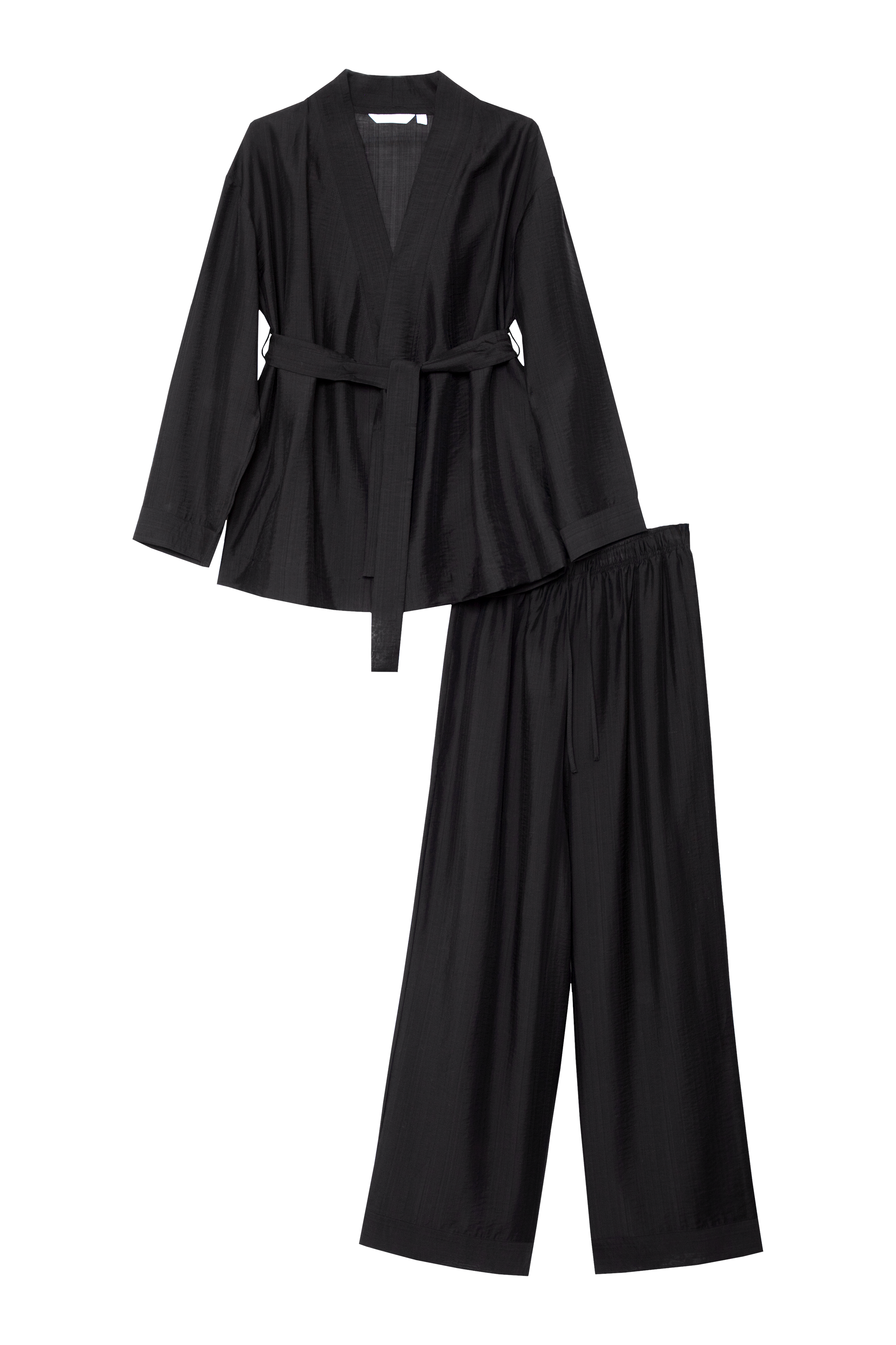 - Zestaw składa się z topu w stylu wrap oraz spodni z szeroką nogawką.