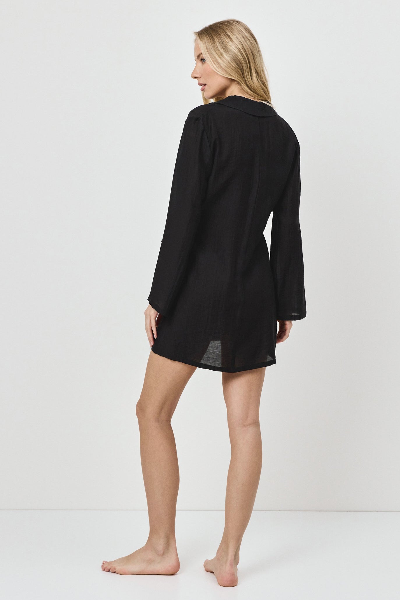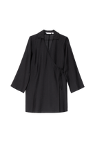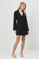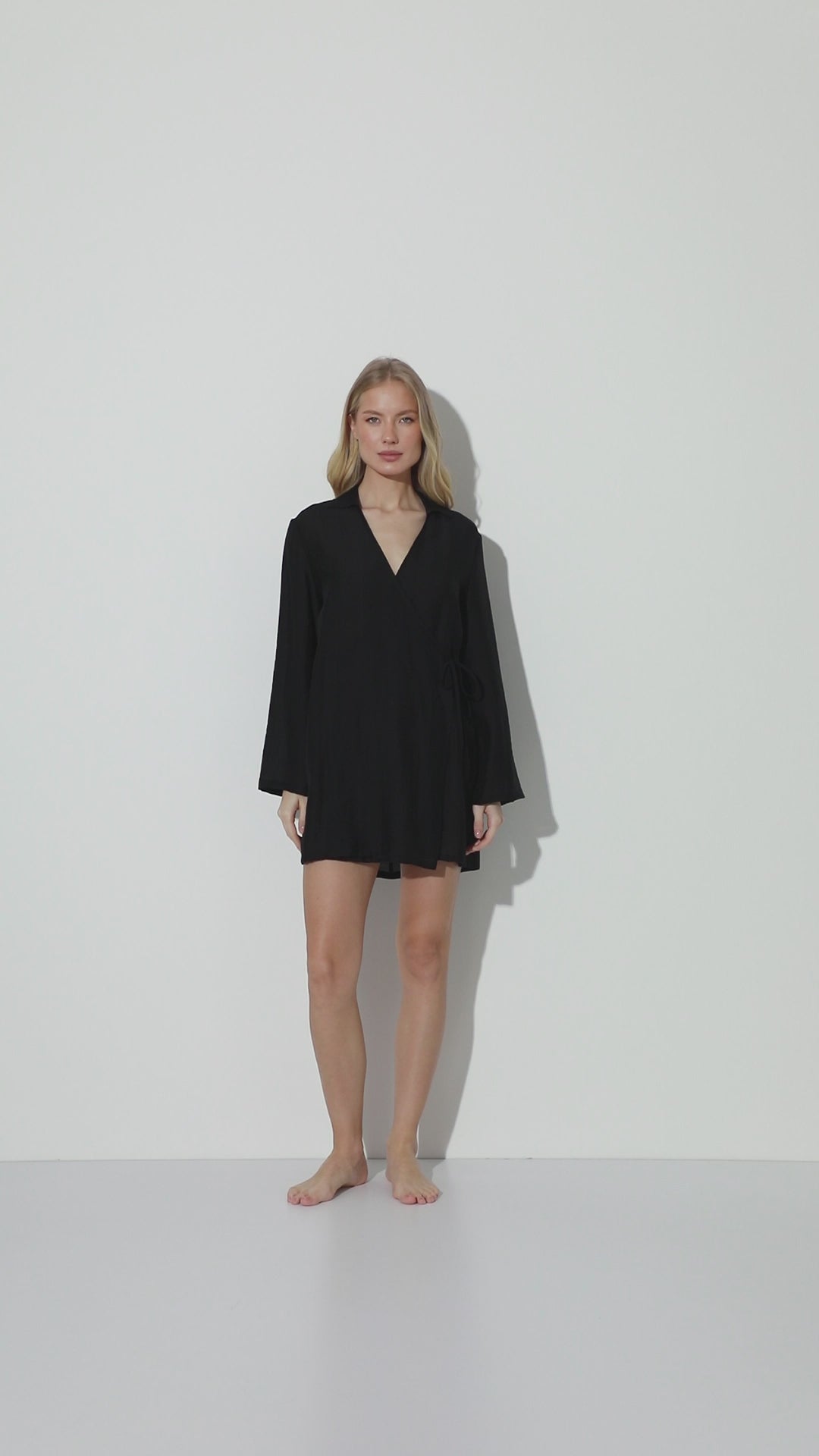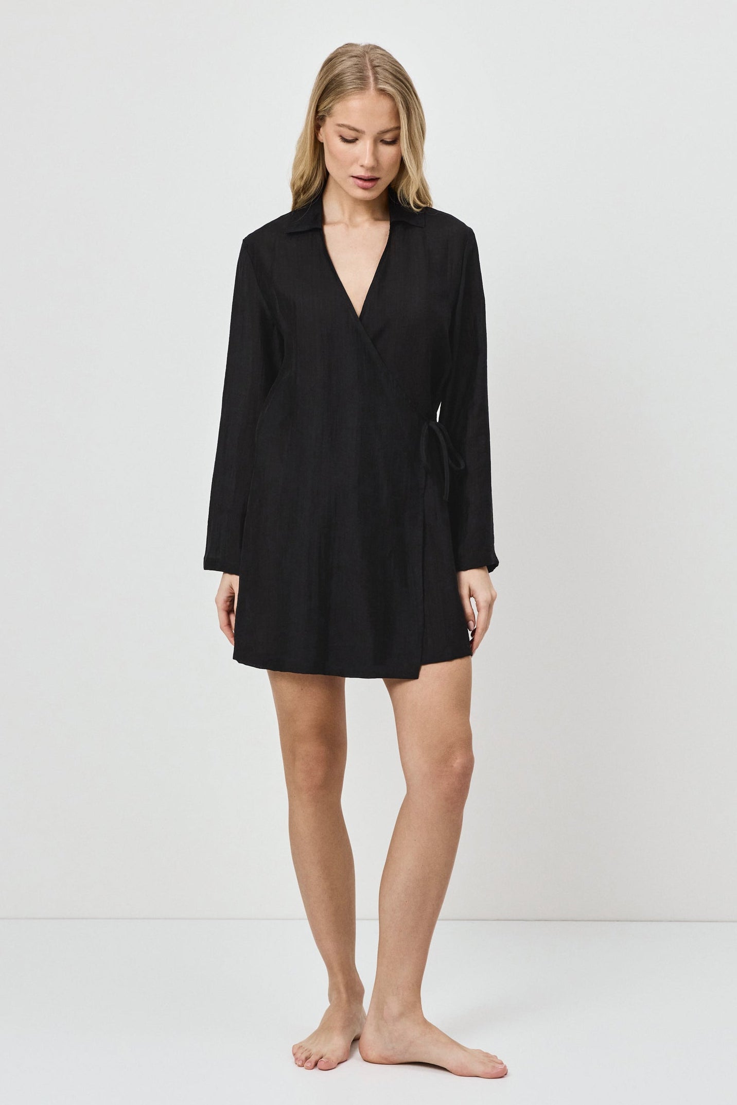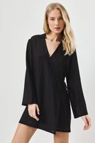 Uniwersalna czarna sukienka typu wrap, idealna do swobodnych stylizacji resortowych lub jako lekka warstwa na plaży.