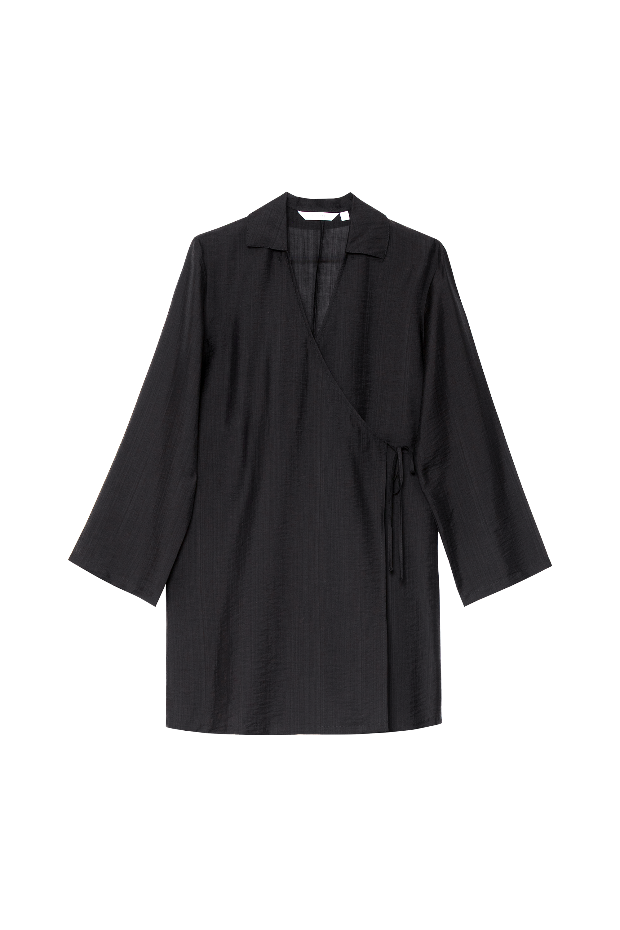 - Model posiada kopertowy przód z regulowanym wiązaniem w talii, długie rękawy z lekkim rozszerzeniem oraz miękki kołnierz.
