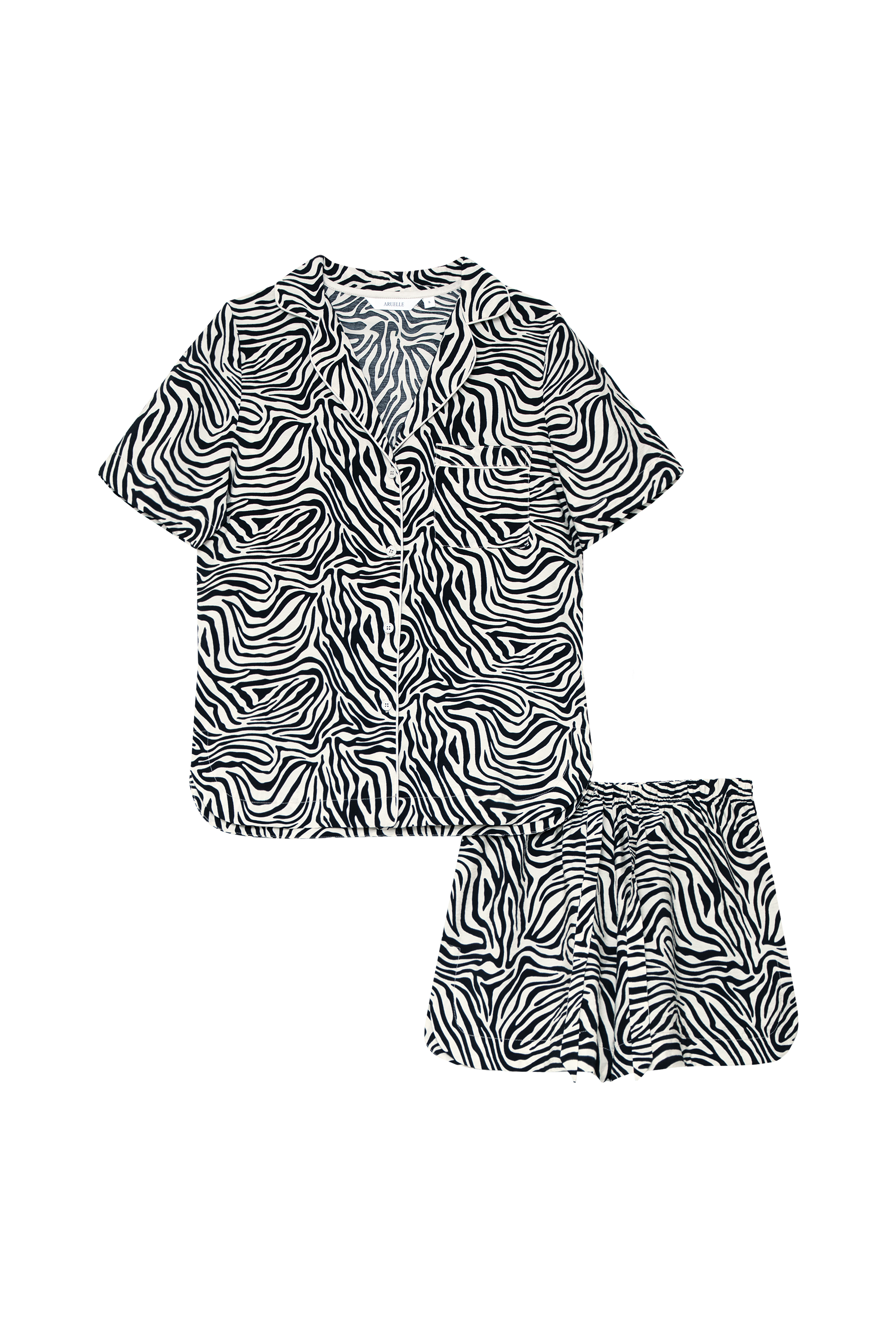 - Zestaw składa się z koszuli z krótkim rękawem, zapinanej na guziki, oraz szortów o swobodnym kroju.