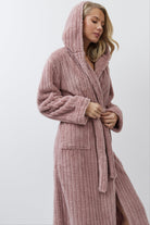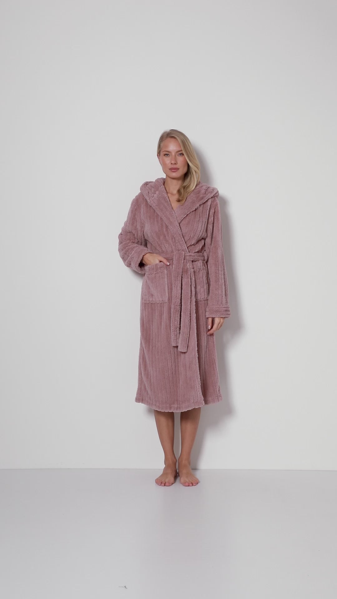 Przytulny i stylowy szlafrok z kapturem o miękkiej, teksturowanej powierzchni.