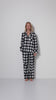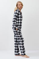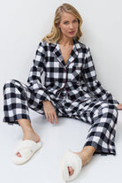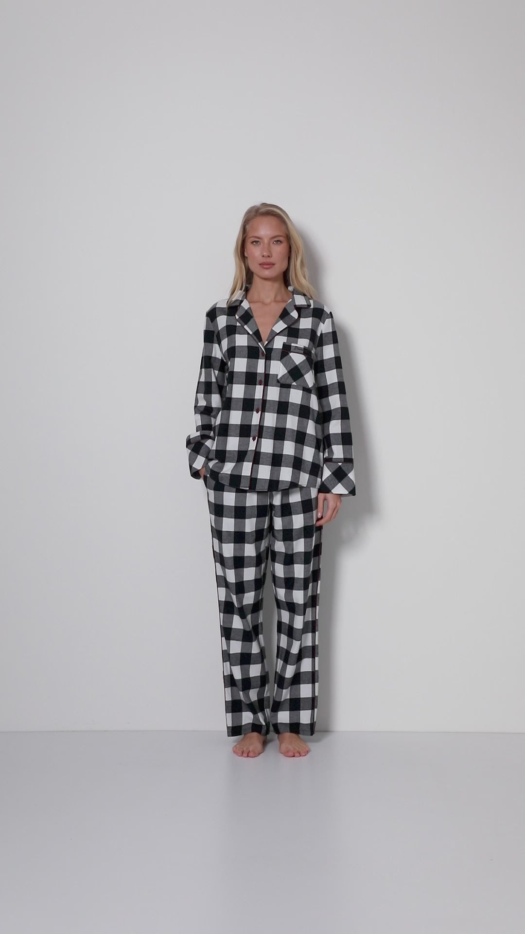 Czarno-biała, kraciasta piżama z kontrastującymi bordowymi lamówkami.
