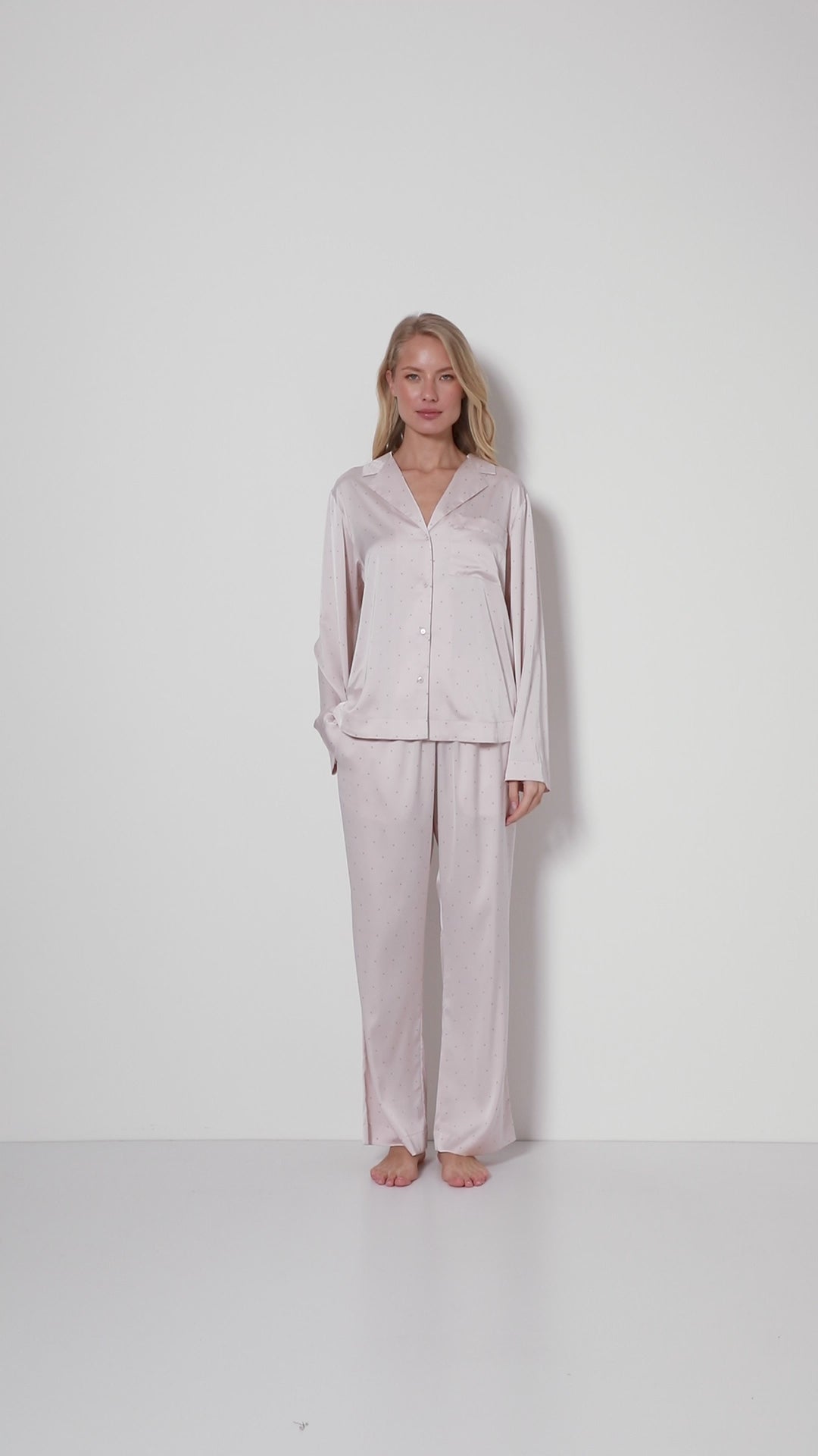 Luksusowy komplet piżamowy z różowego atłasu ze spodniami.
