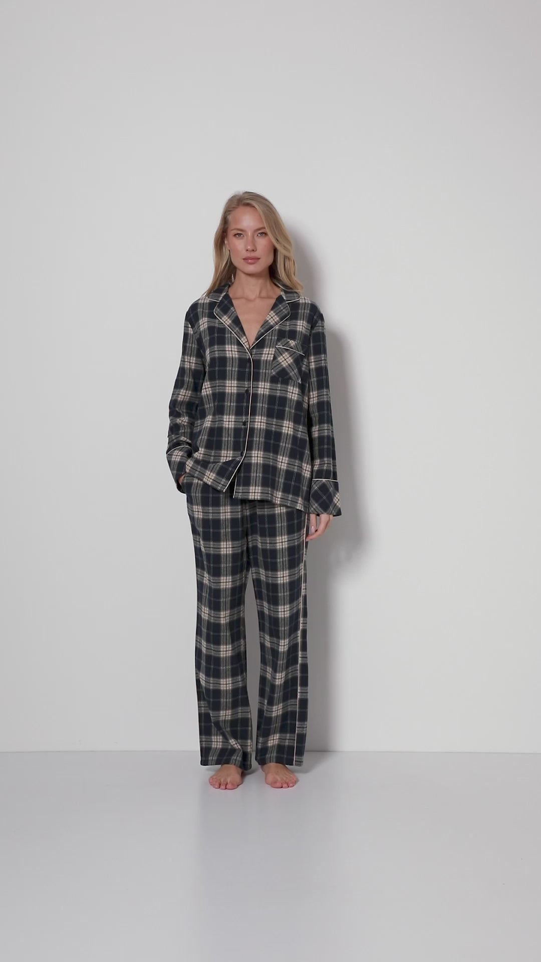 Klasyczny i ponadczasowy komplet piżamowy ze spodniami.