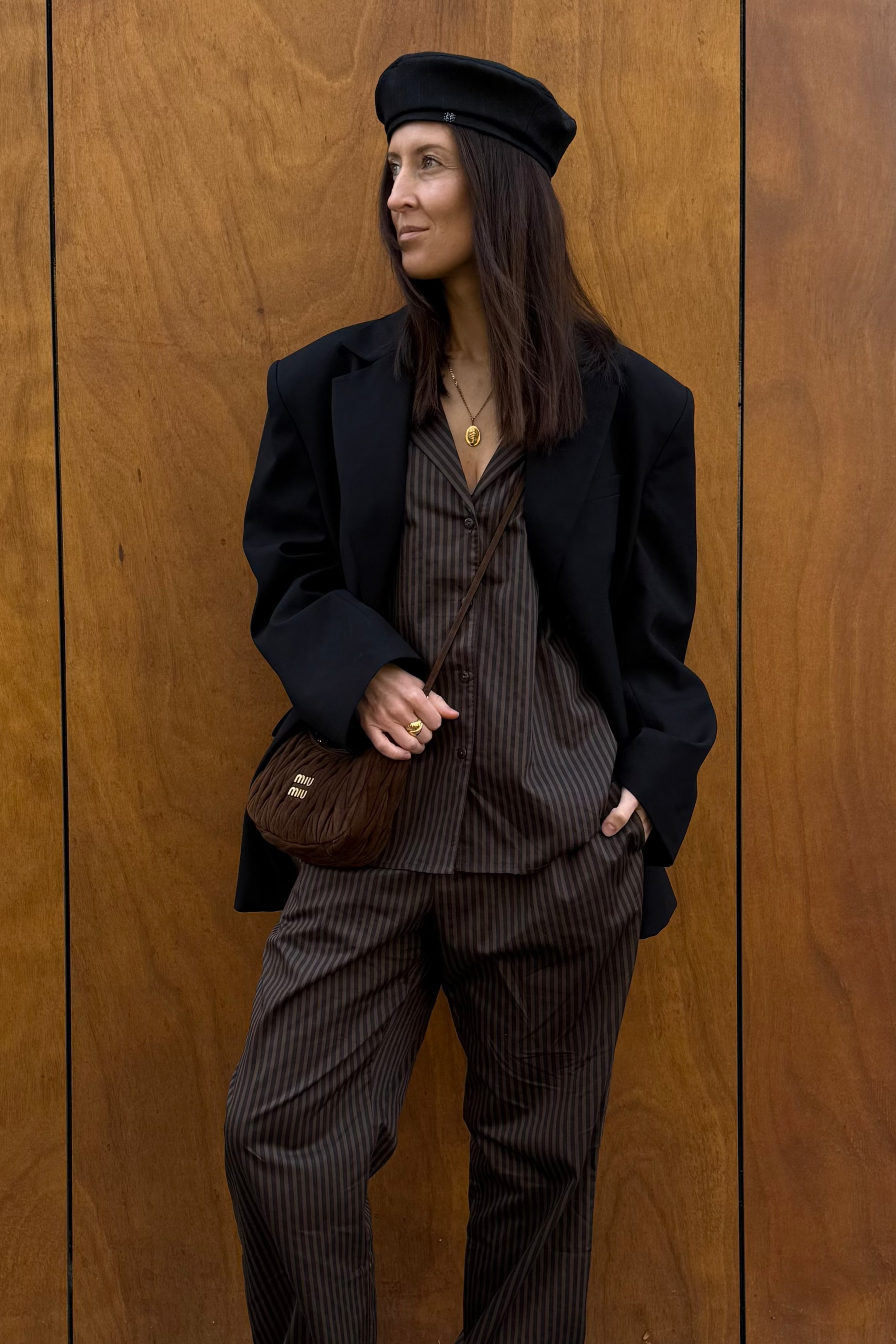 - Górna część w klasycznym stylu koszulowym, z lamówką na krawędziach mankietów i haftowaną koroną w dopasowanym brązowym kolorze na piersi.