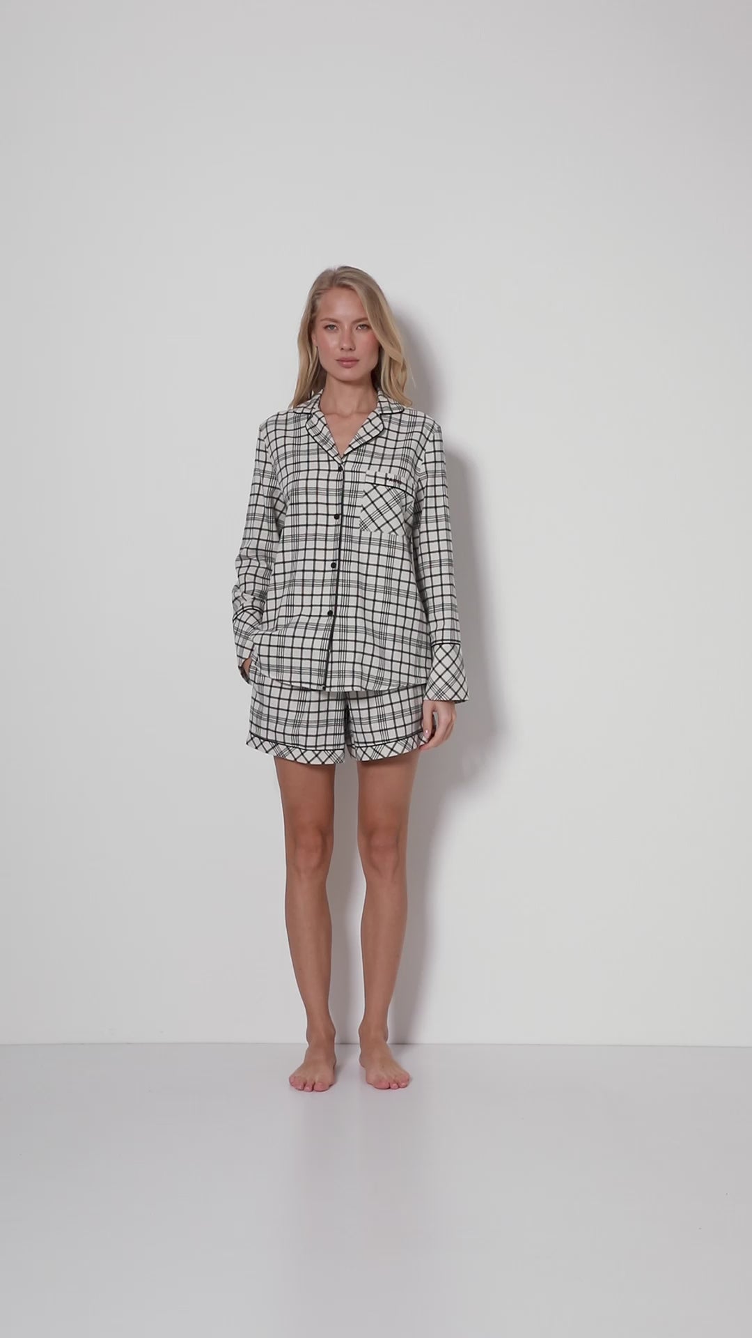 Klasyczny i modny komplet piżamowy z szortami, ze wzorem drobnej kraty w kolorze ecru i czerni.